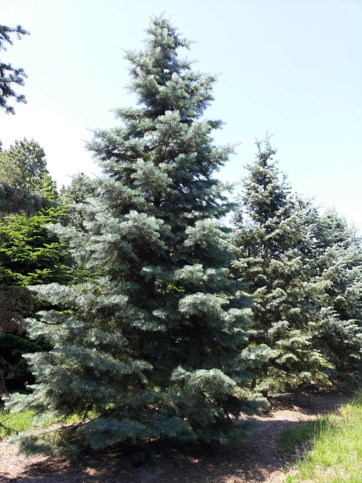 blauwgrijze naalden, 4 - 7 cm, sikkelvormig omhoog gebogen, wintergroen