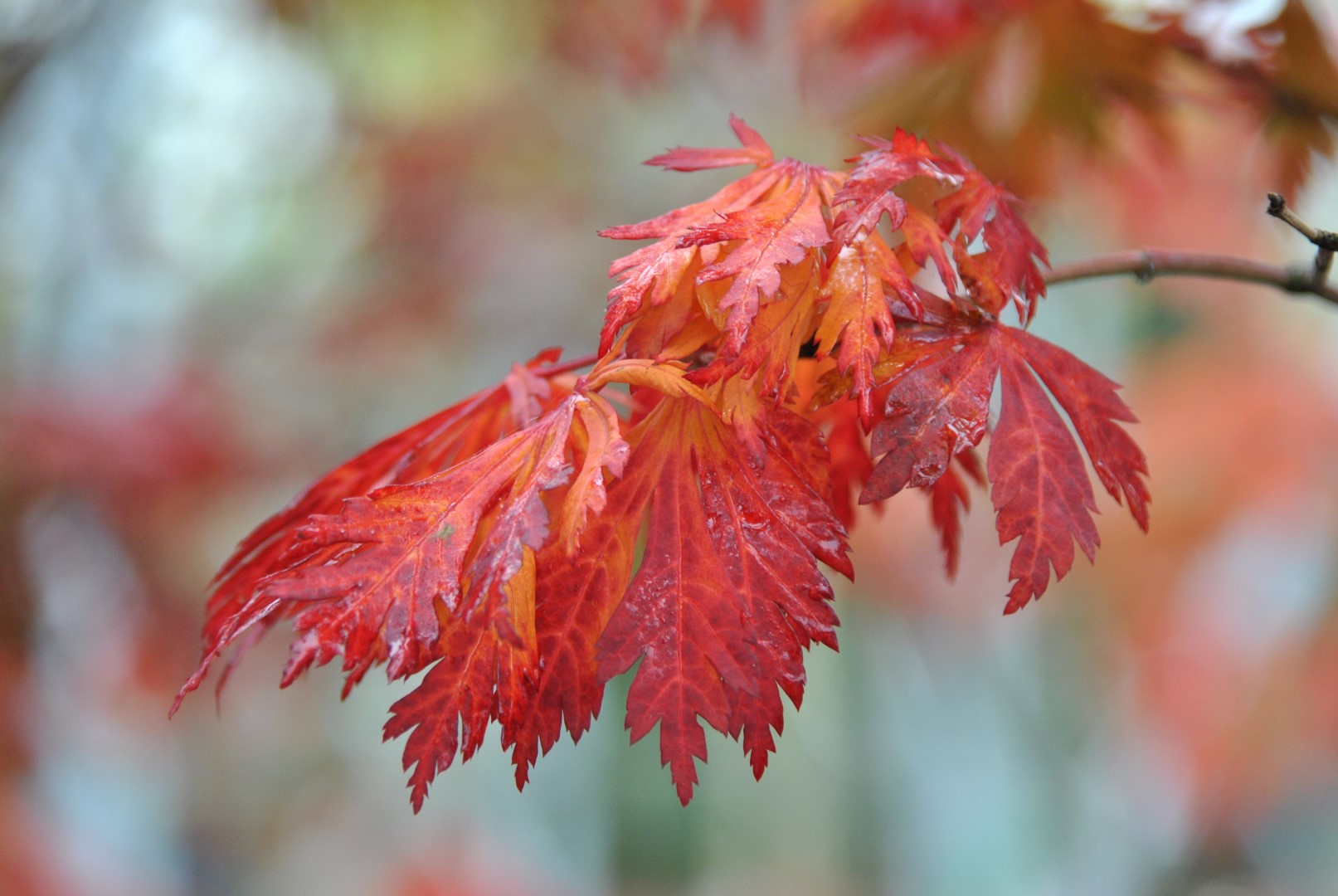 De bladeren van de Acer japonicum 'Aconitifolium' kleuren in de herfst geel, oranje, rood, purper.