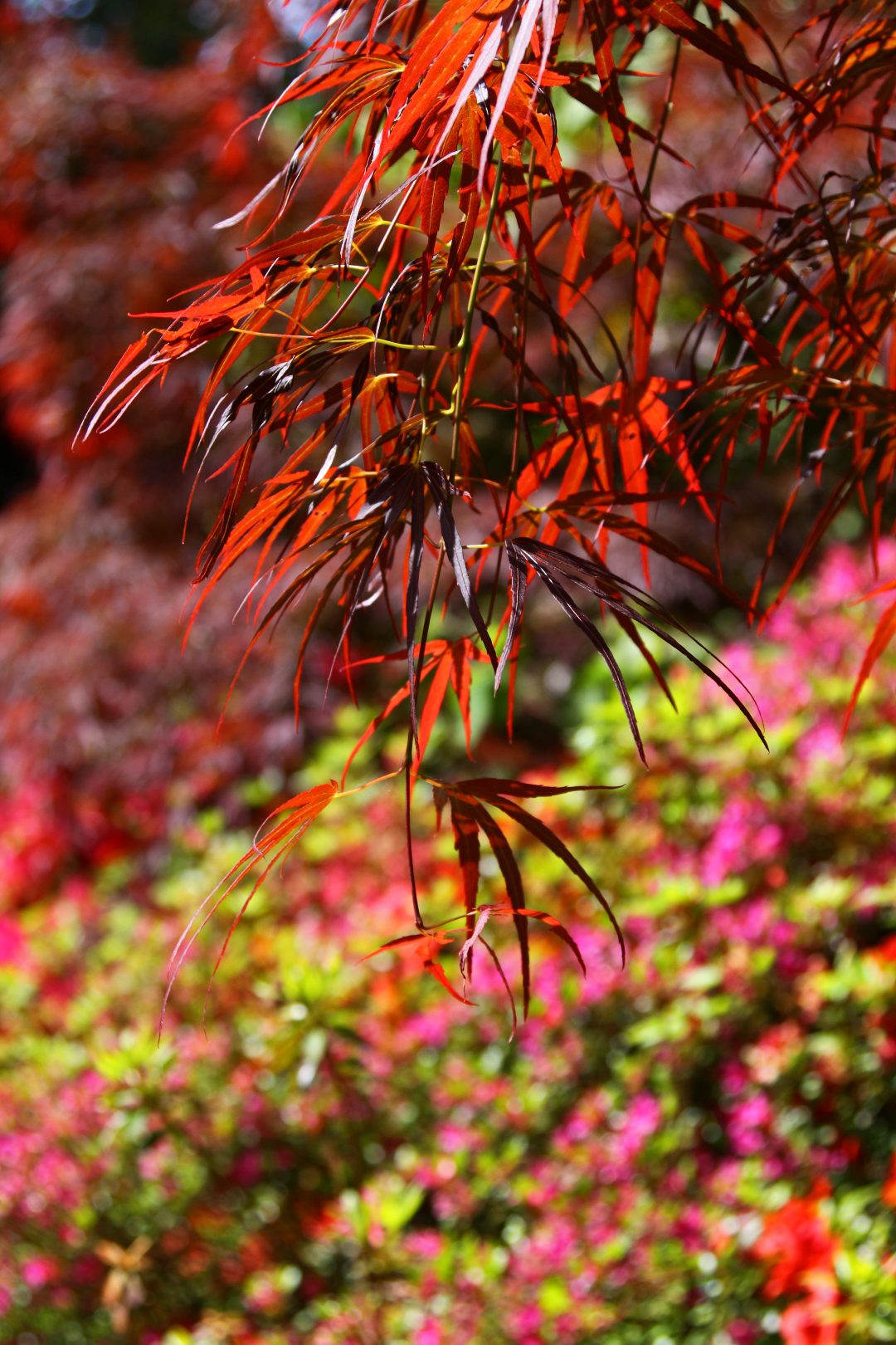 De bladeren van de Acer palmatum 'Atrolineare' kleuren in de herfst oranje, rood.