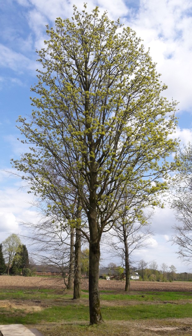 Acer platanoides 'Columnare' bloeit in april.