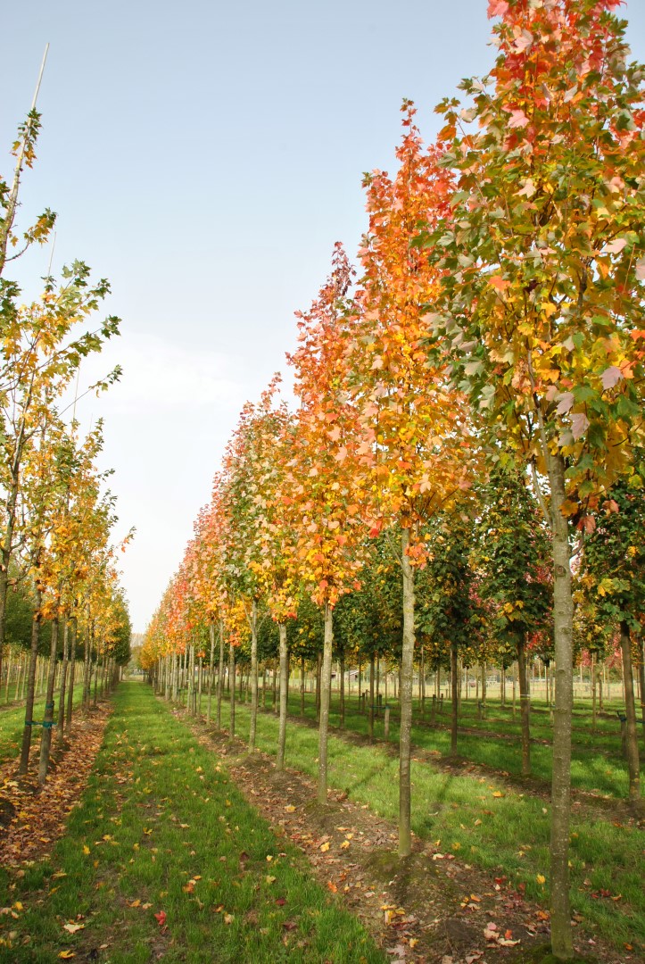 De bladeren van de Acer rubrum 'Bowhall' kleuren in de herfst oranje, rood.