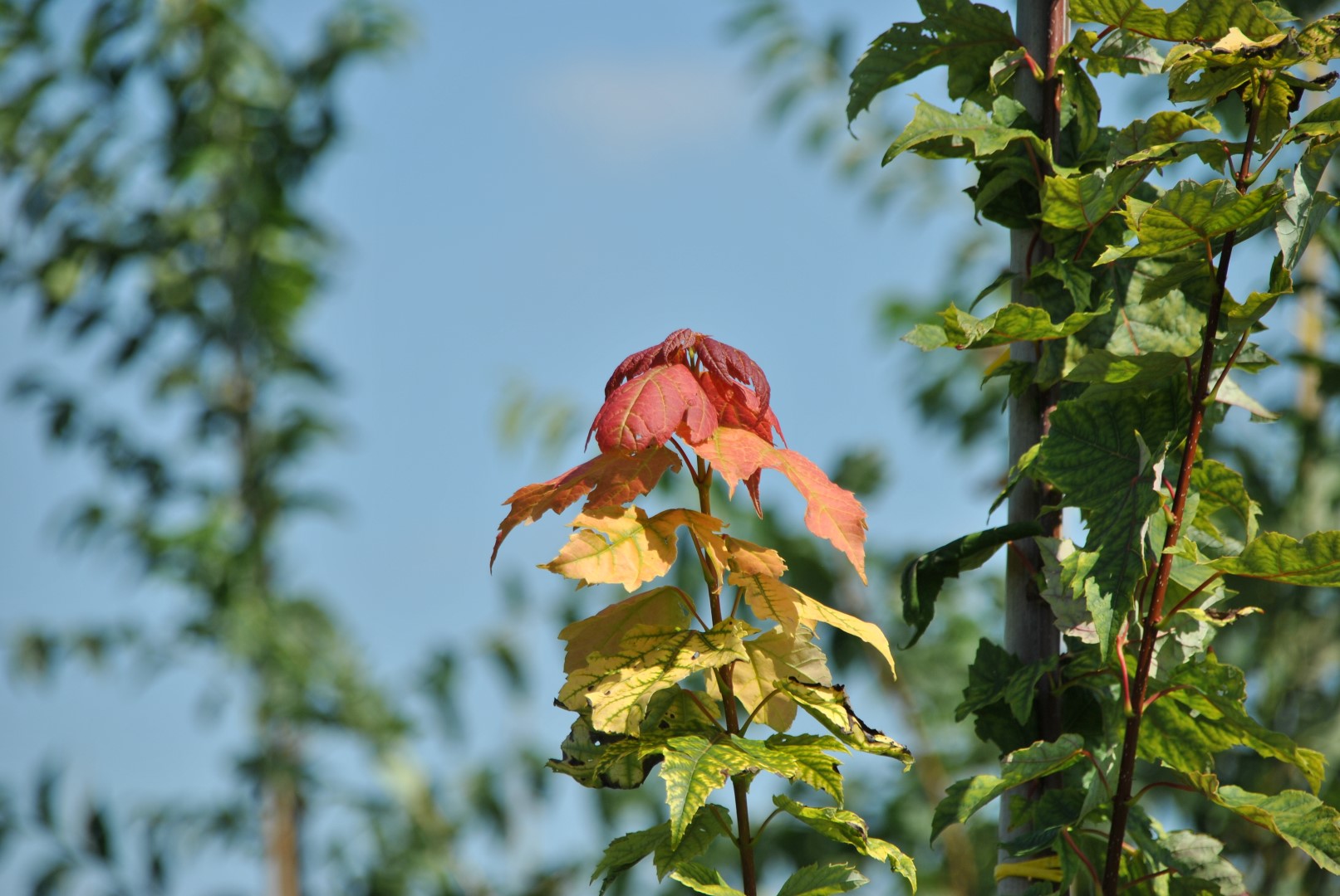 De bladeren van de Acer rubrum 'Red Rocket' kleuren in de herfst oranje.