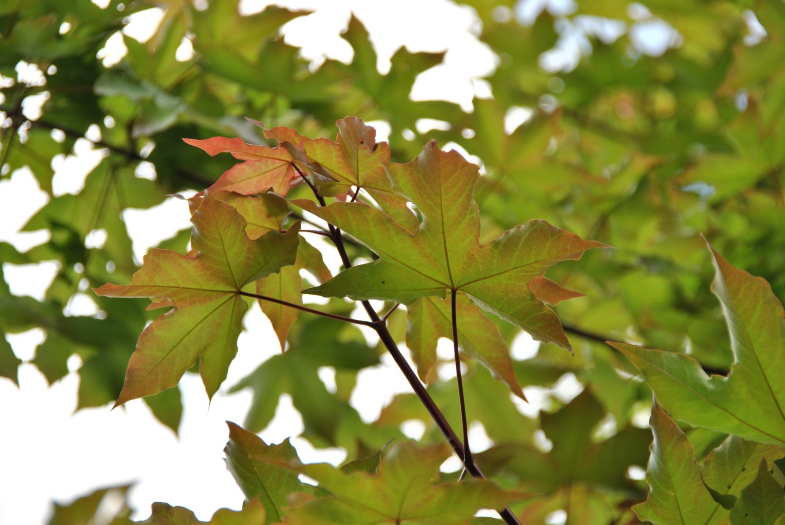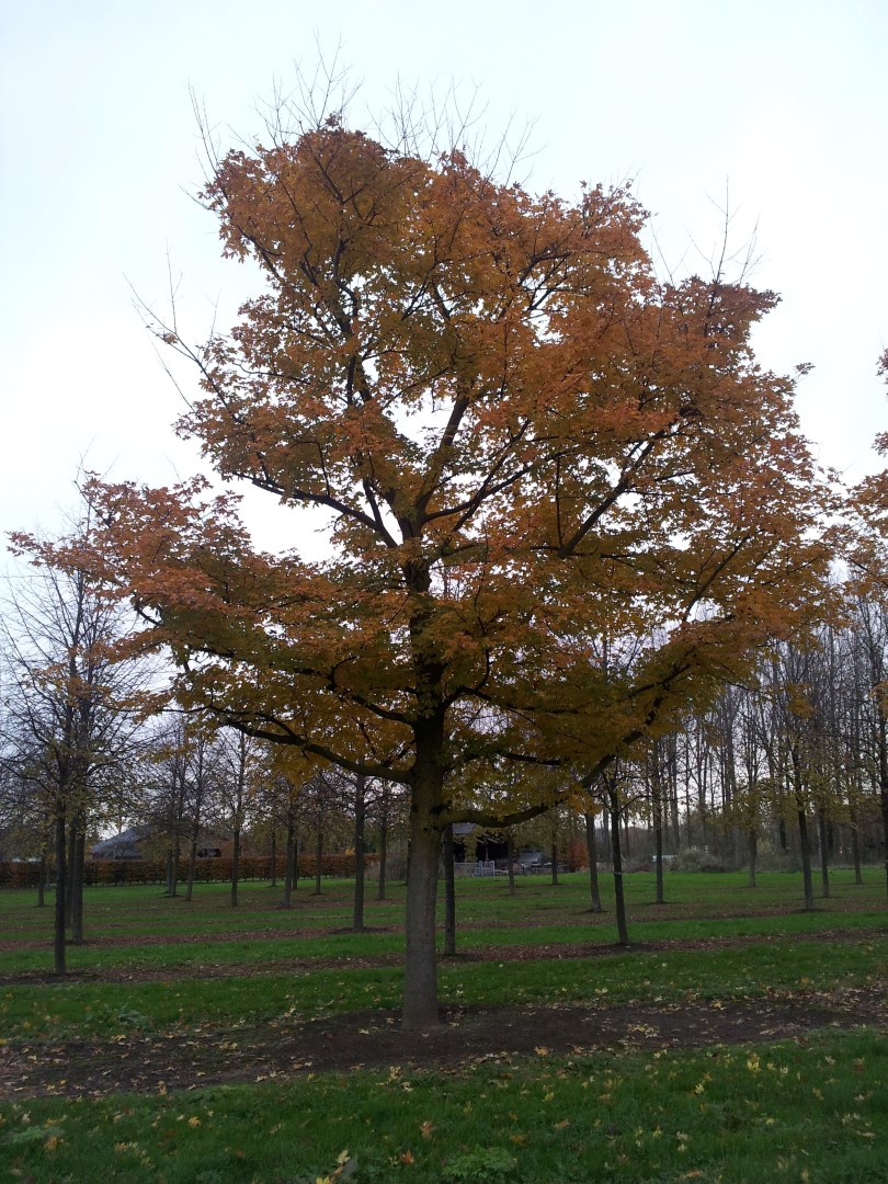 De bladeren van de Acer ×zoeschense 'Annae' kleuren in de herfst oranje, rood.