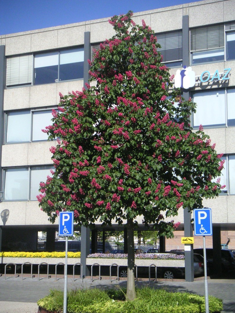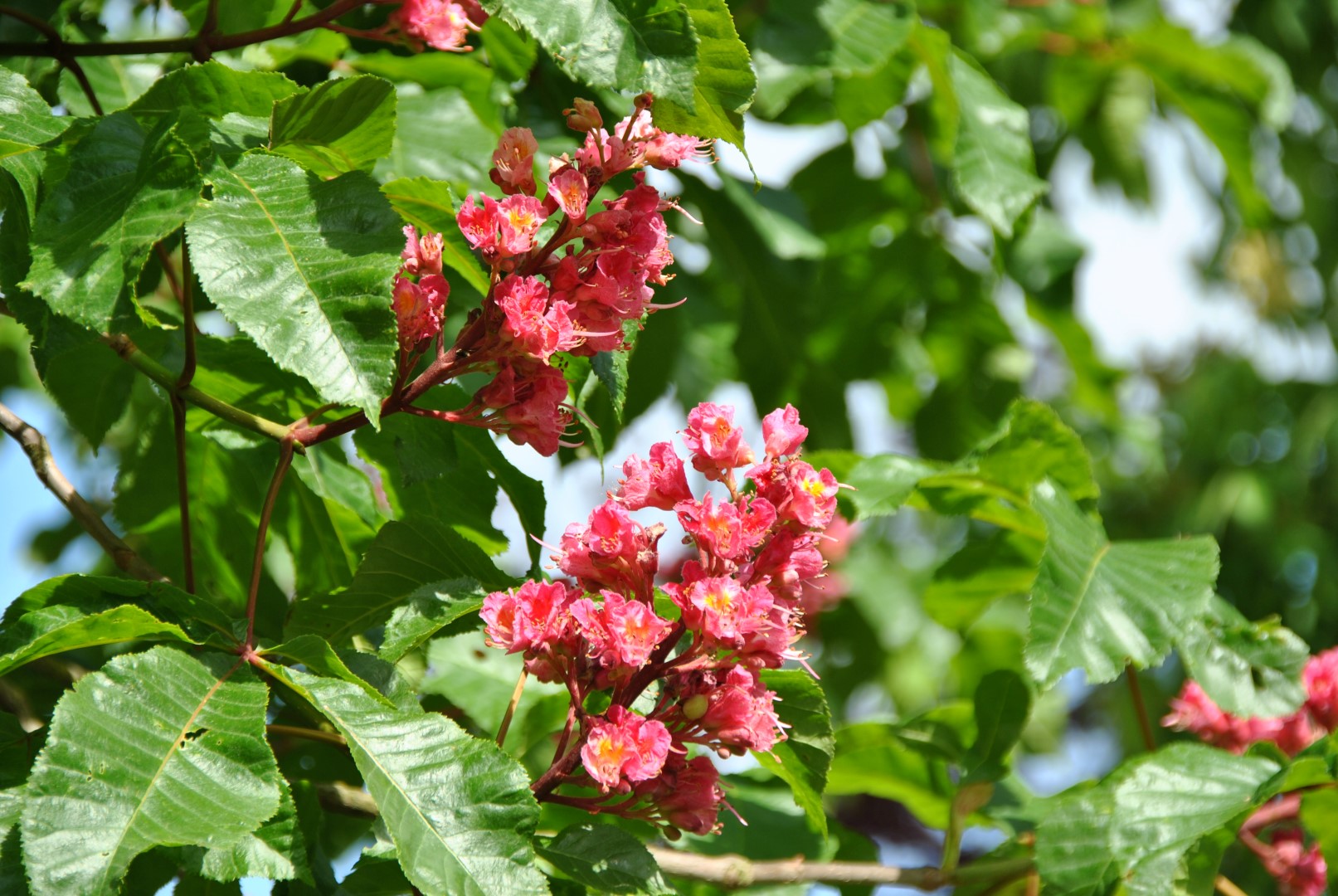 Aesculus ×carnea 'Briotii' bloeit in mei.