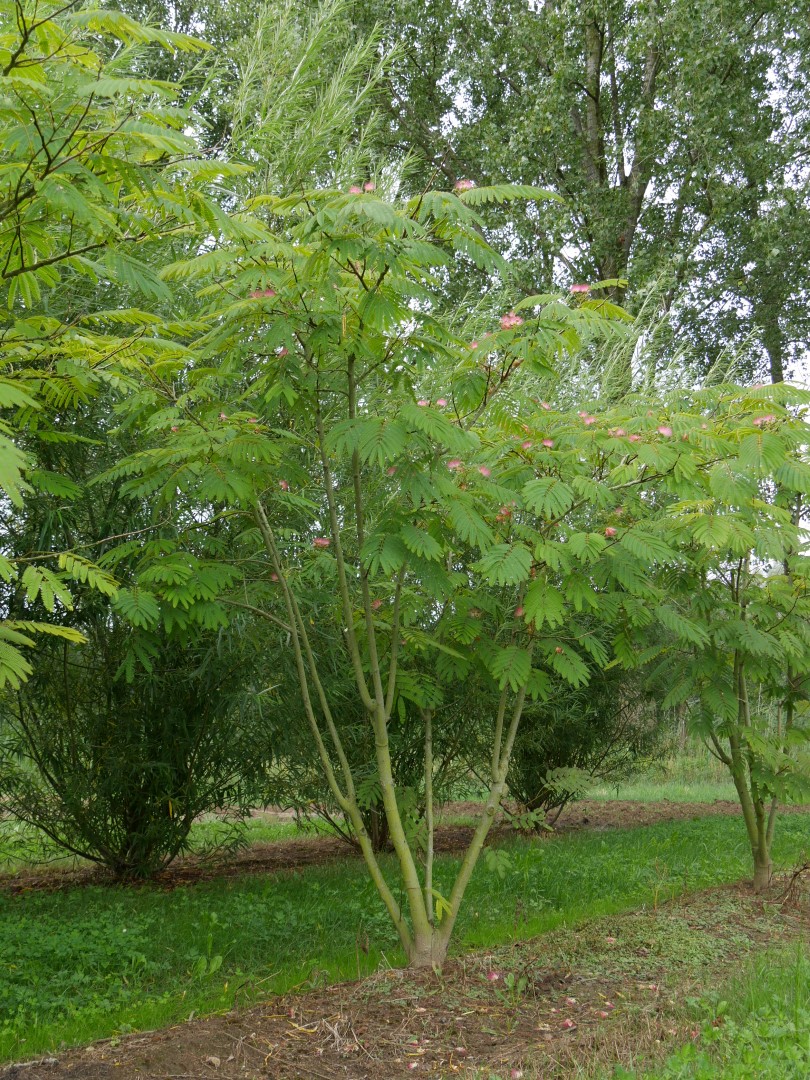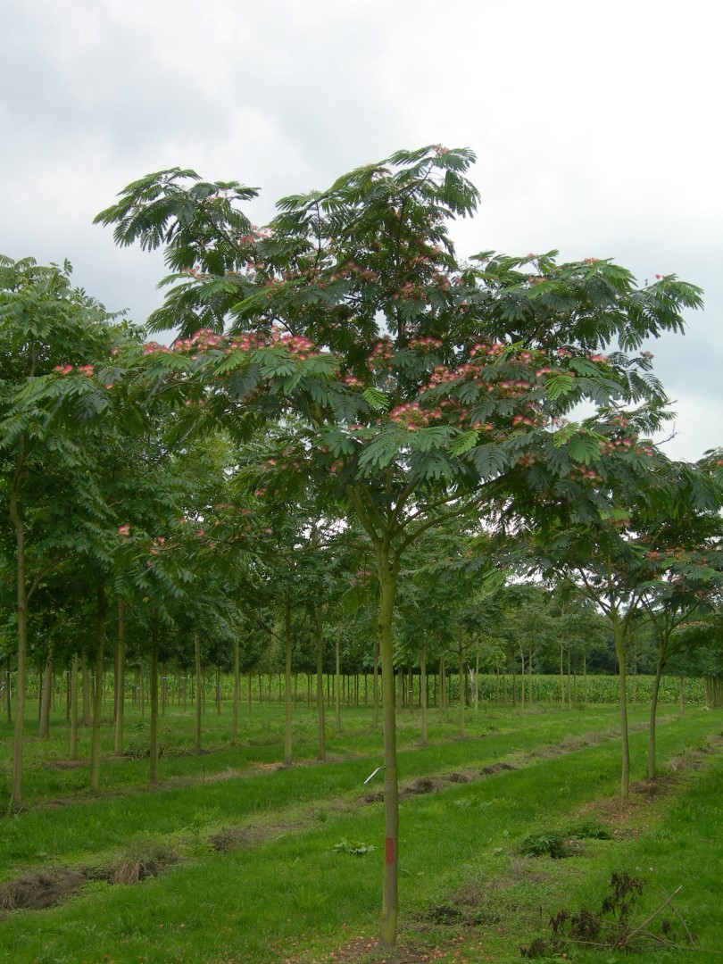 Hoogstam boom Meerstammige boom Kleigrond Lemige grond Zandgrond verdraagt geen verharding Lichtminnend Kan op droge grond Bestand tegen wind Breed vaasvormig 1ste grootte, boom hoger dan 12m Halfopen kroon Groen Roze Juli Late uitloop Gemiddelde groeisnelheid Opvallende bloei Geveerd blad Drachtboom voor bijen Niet giftig (gewoonlijk) Grillig groeiend Sierlijke vruchten Speelboom