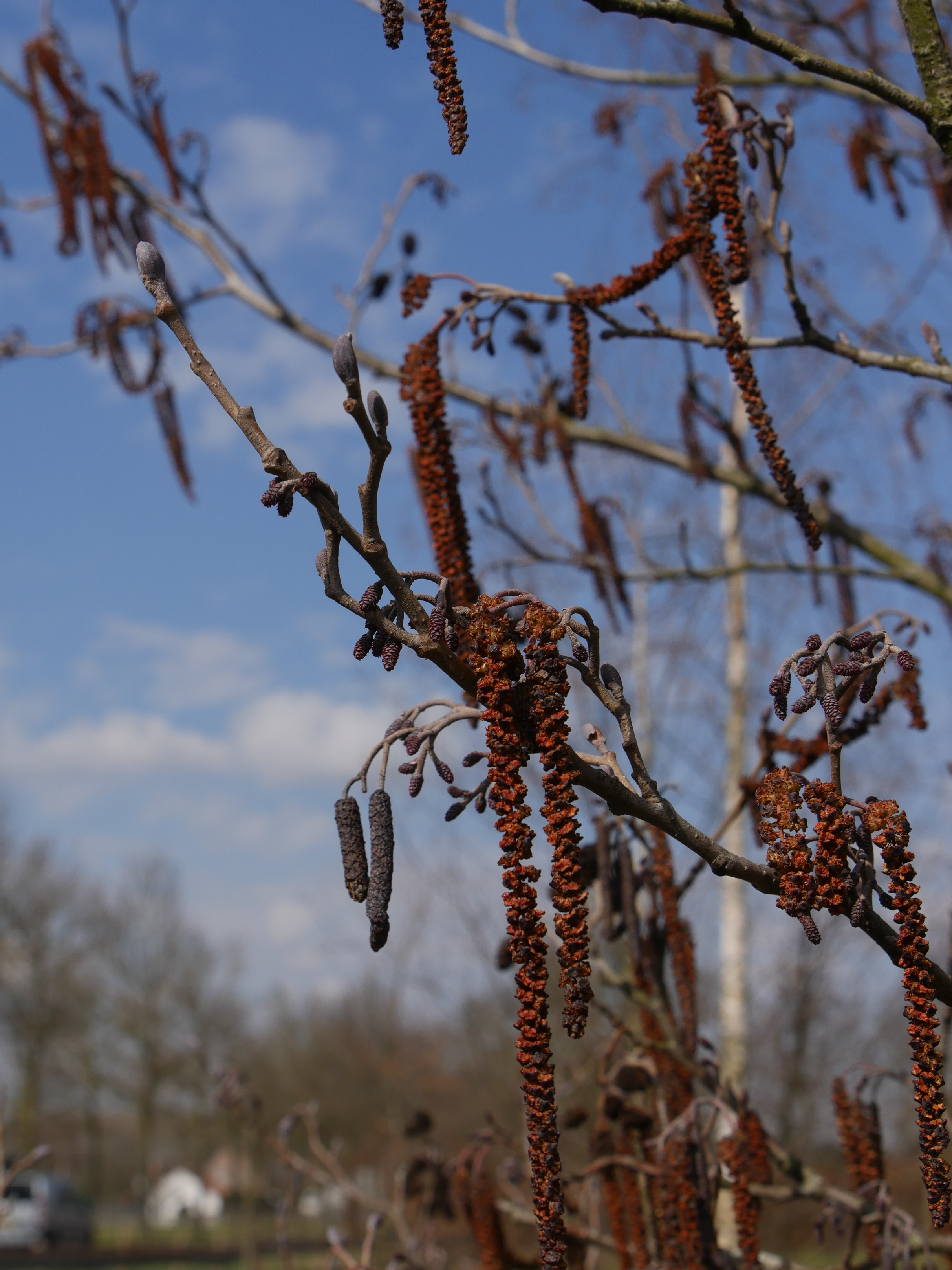 Alnus glutinosa bloeit in maart.