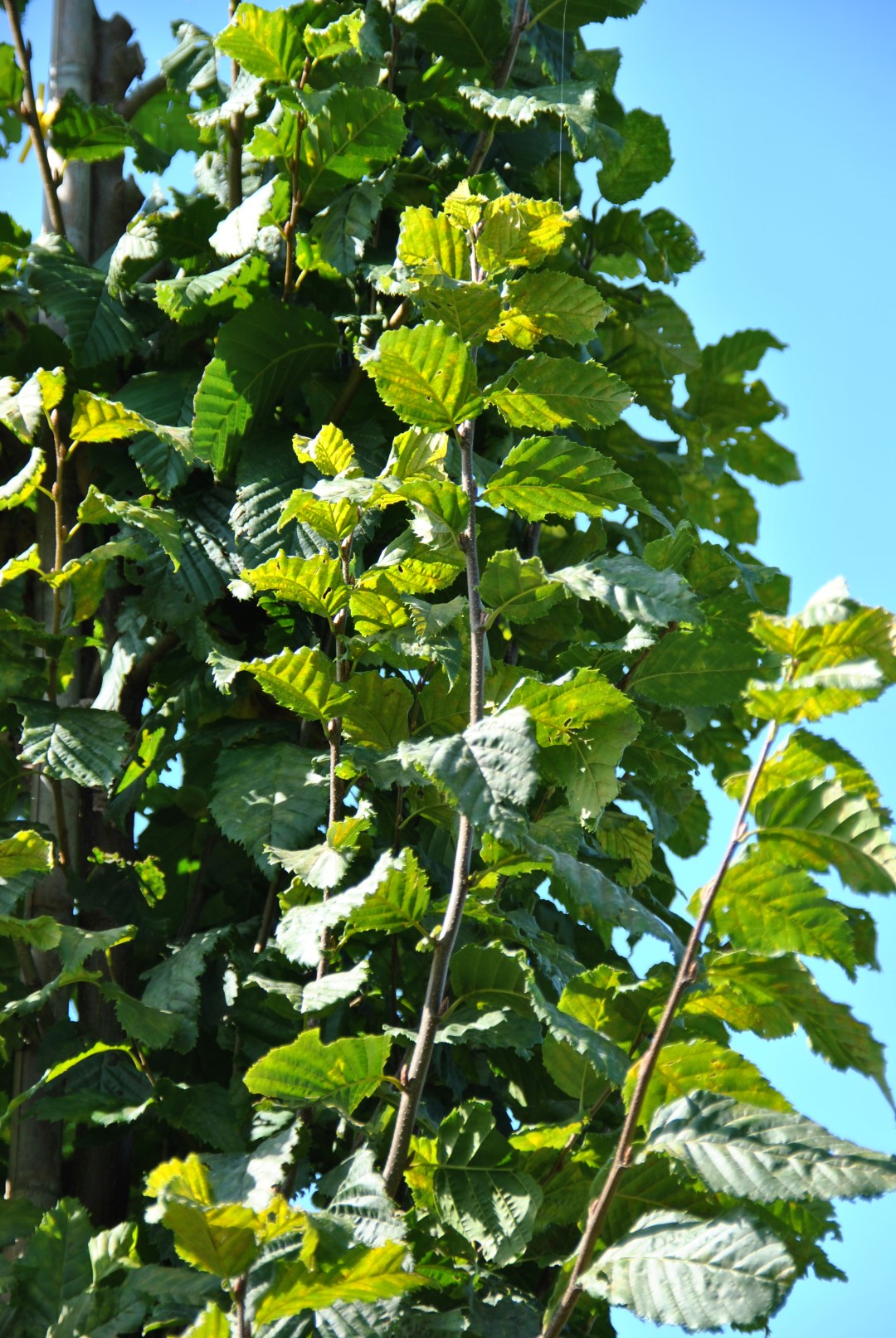 De bladeren van de Carpinus betulus 'Nord' kleuren in de herfst geel.