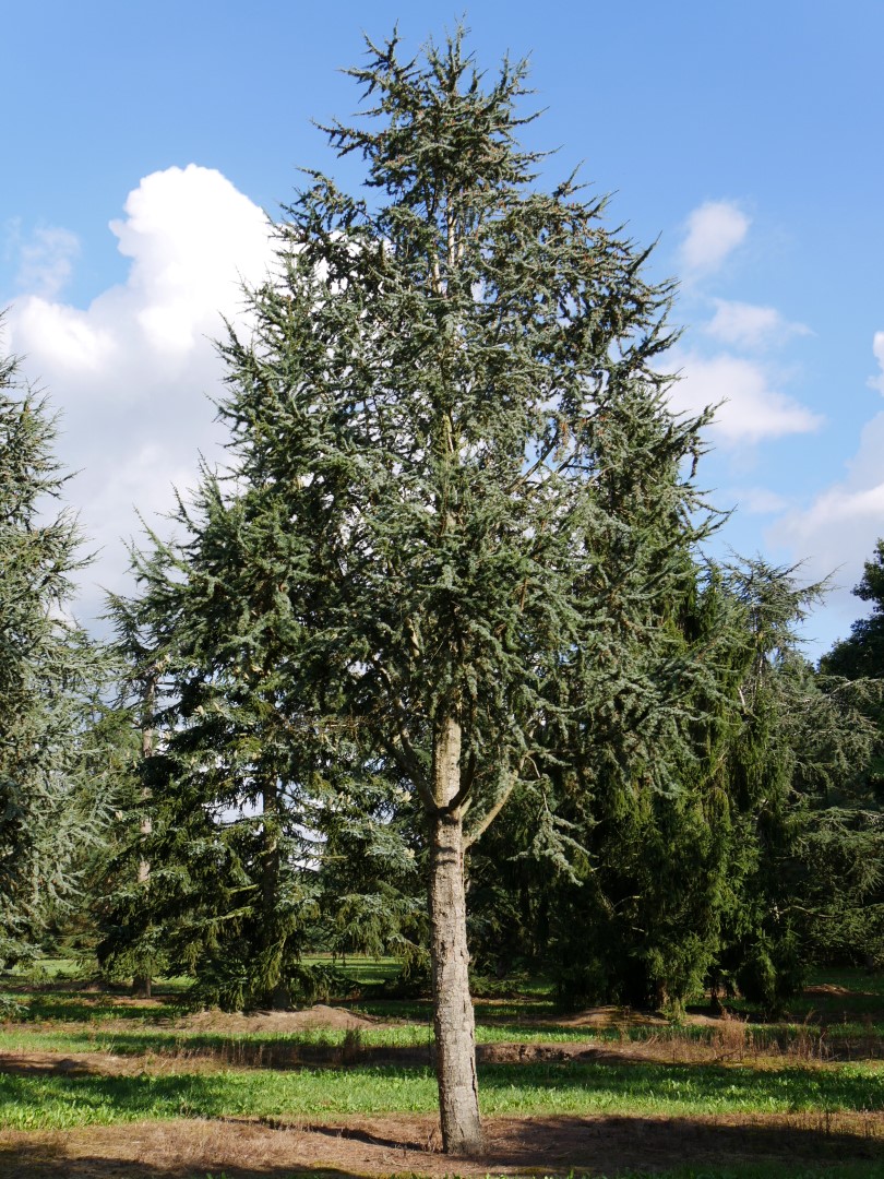 Cedrus libani 'Glauca Fastigiata' bloeit in september.