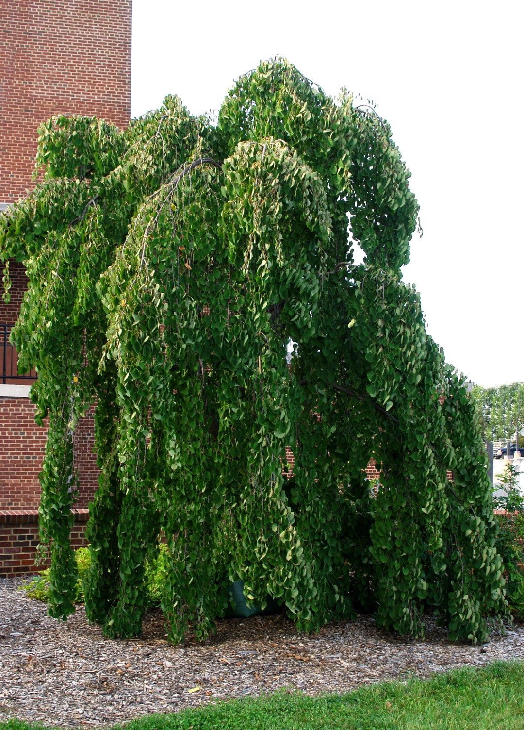 Relatief snelgroeiende kleine tot middelgrote boom met sterk afhangende takken waardoor een brede treurvorm ontstaat. Kan uiteindelijk circa 8 m hoog en minstens zo breed worden. De bast is grijs en laat op latere leeftijd in stroken los. Het bijna ronde blad loopt licht bronsgroen uit en kleurt in de zomer (blauw)groen. De herfstkleur is bruingeel tot oranjegeel. Net zoals bij de soort geurt het afvallende blad aangenaam kruidig/kaneelachtig. Werd al in de 17e eeuw bij een boeddhistische tempel op het Japanse eiland Honshu gecultiveerd. Houdt van een losse, liefst leemhoudende bodem. Kan slecht tegen droogte. Het voorjaarsblad is gevoelig voor nachtvorst. Bij uitstek een boom voor toepassing als solitair in een grote tuin of park.