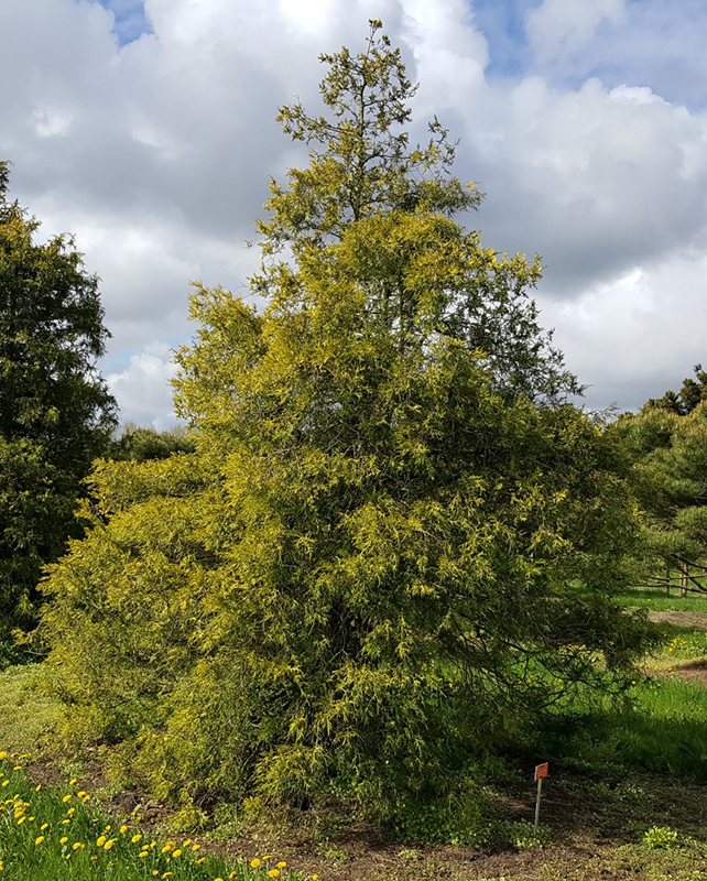 Solitaire conifeer Zure grond Kleigrond Lemige grond Veengrond Zandgrond verdraagt geen verharding Bestand tegen vorst (WH 1 t/m 6) Schaduwdragend Smal Piramidiaal 2de grootte, boom tussen 6 en 12m Dichte kroon Geel Gemiddelde groeisnelheid Niet giftig (gewoonlijk) Geurende bloemen
