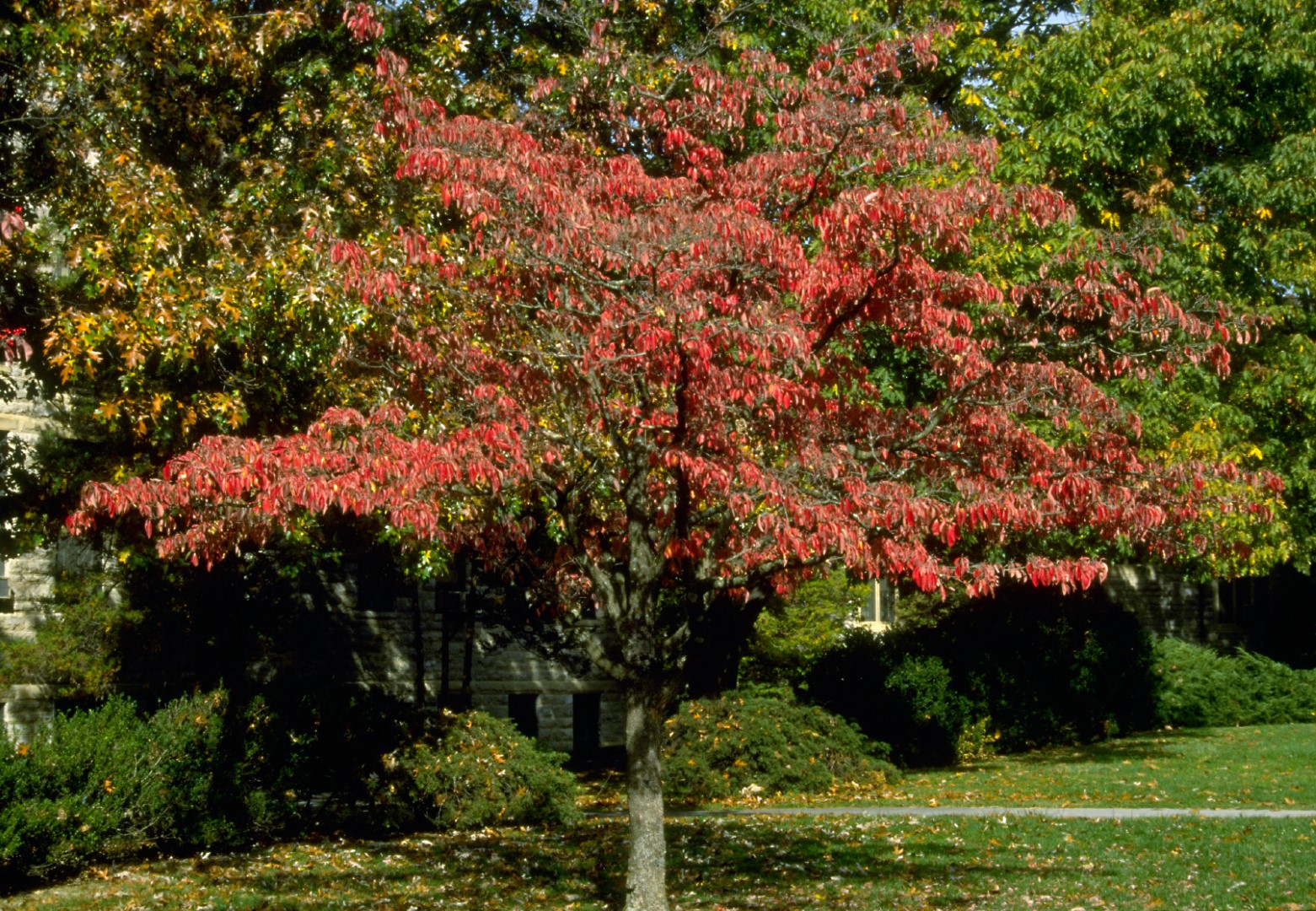 De bladeren van de Cornus florida kleuren in de herfst rood, purper.