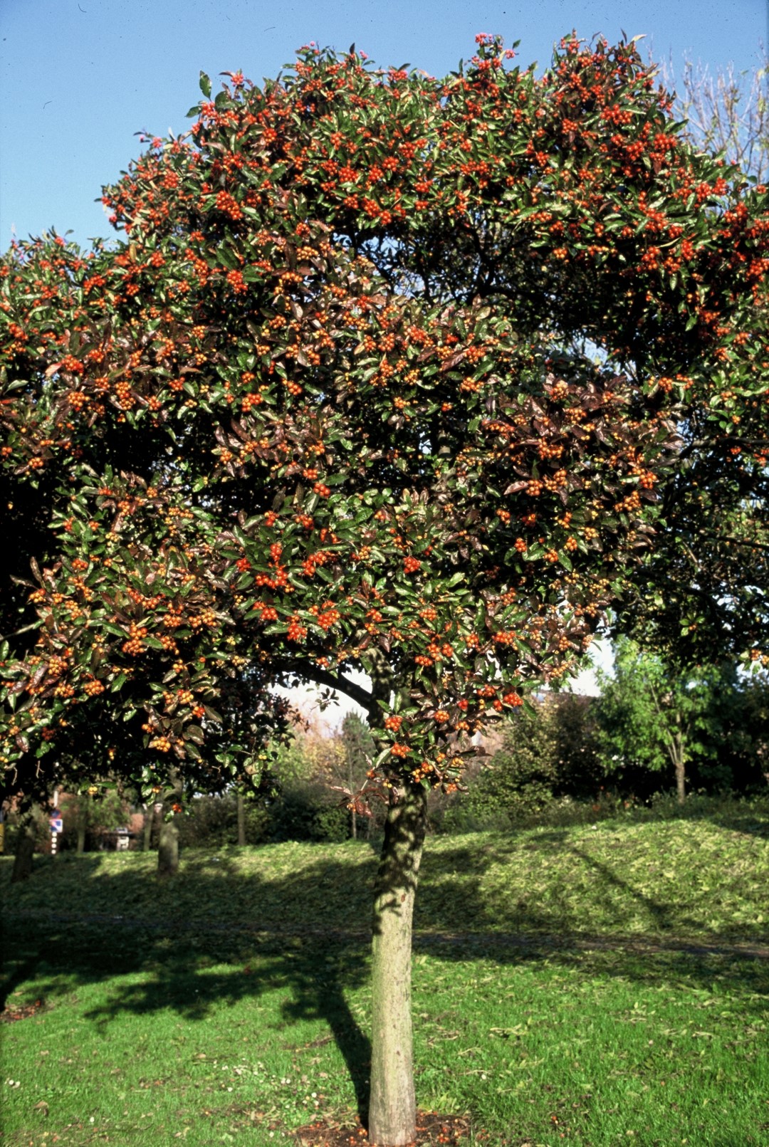 Een enkele keer als forse struik, echter vaker als kleine boom gekweekt. De kroon groeit in eerste instantie opgaand maar wordt uiteindelijk onregelmatig, min of meer rond. Breedte tot 5 m. De kroon doet zwaar aan vanwege de dichtheid en vanwege het donkere blad. Dit blad is glanzend donkergroen en voelt leerachtig aan. Aan de voorjaarsscheuten zitten roodgroene bladeren. De takken zijn voorzien van talrijke grote doorns, circa 4 cm lang. Vanuit de roze knoppen verschijnen in het voorjaar de witte bloemen. Deze worden gevolgd door een grote hoeveelheid doforanje steenvruchten die tot in de winter aanblijven. Deze hebben een doorsnede van circa 2 cm. Heeft een diepgaand en verspreid wortelgestel. Goed bestand tegen droge grond en luchtverontreiniging.
