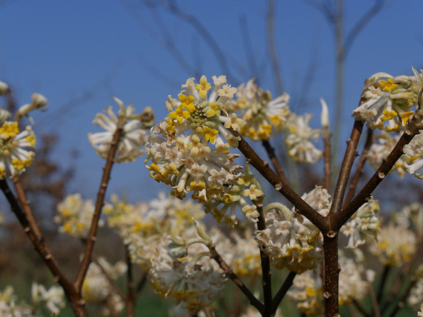 Edgeworthia chrysantha bloeit in februari.