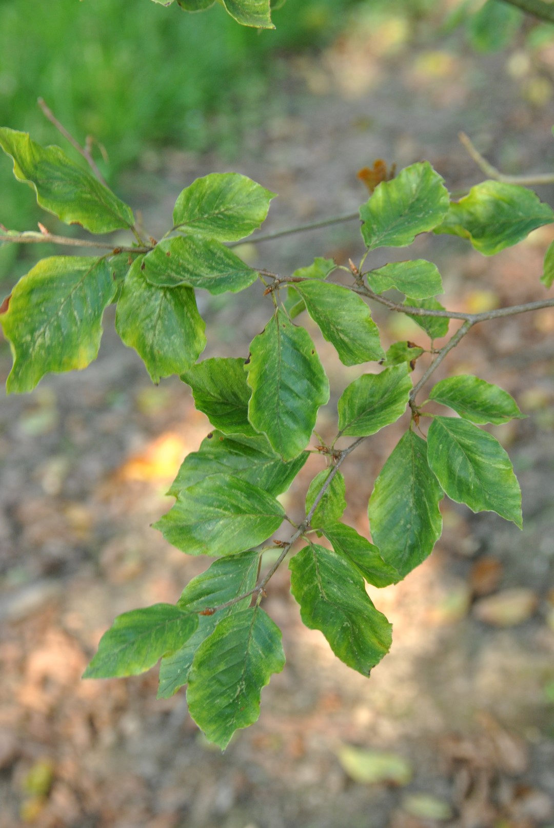 De bladeren van de Fagus sylvatica 'Viridivariegata' kleuren in de herfst geel.