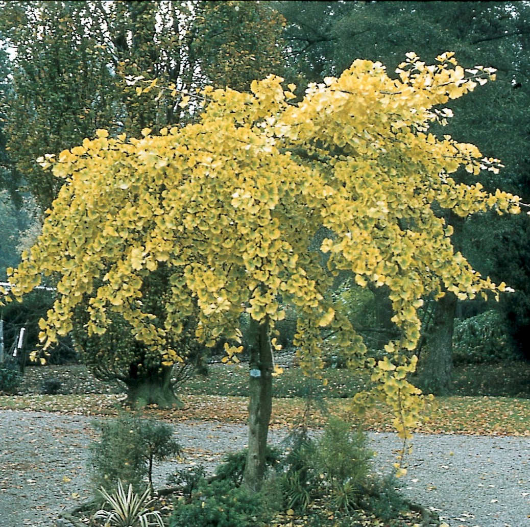 De bladeren van de Ginkgo biloba 'Pendula' kleuren in de herfst geel.