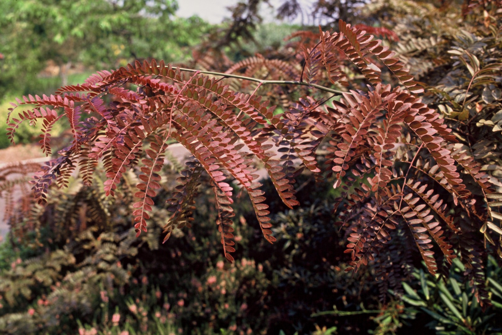 Gleditsia triacanthos 'Rubylace' bloeit in juni.