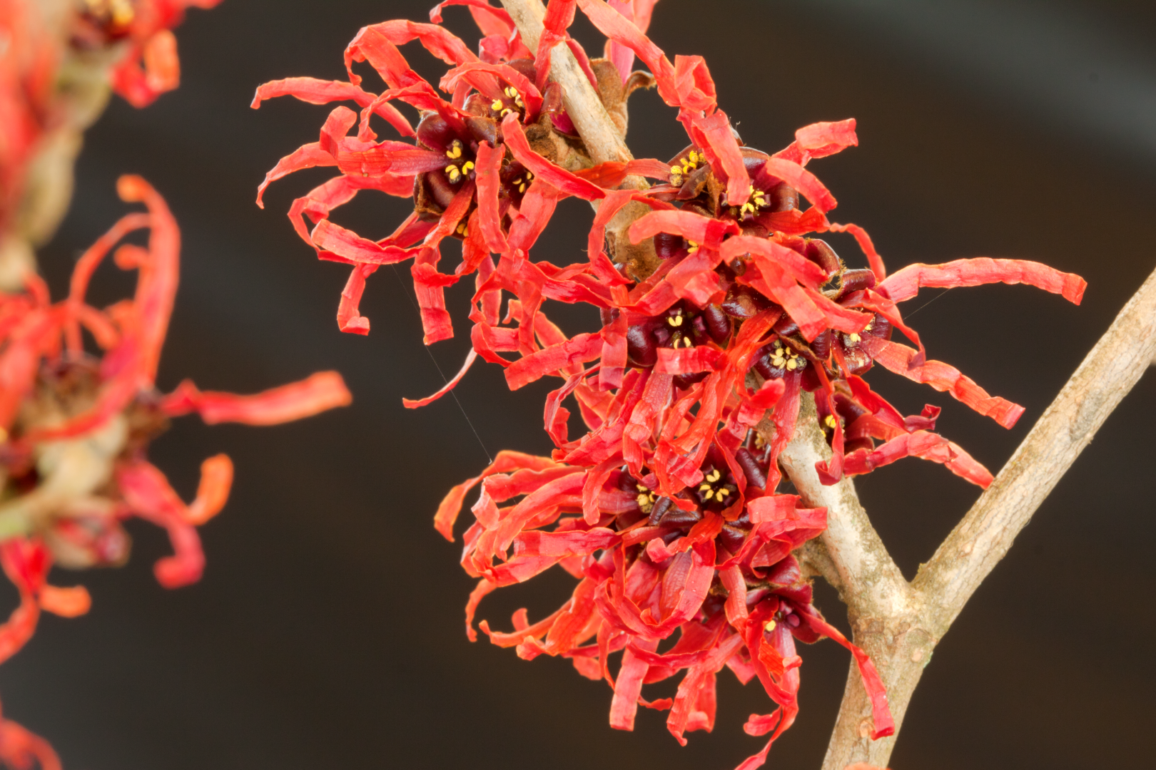 Hamamelis ×intermedia 'Diane' bloeit in januari.