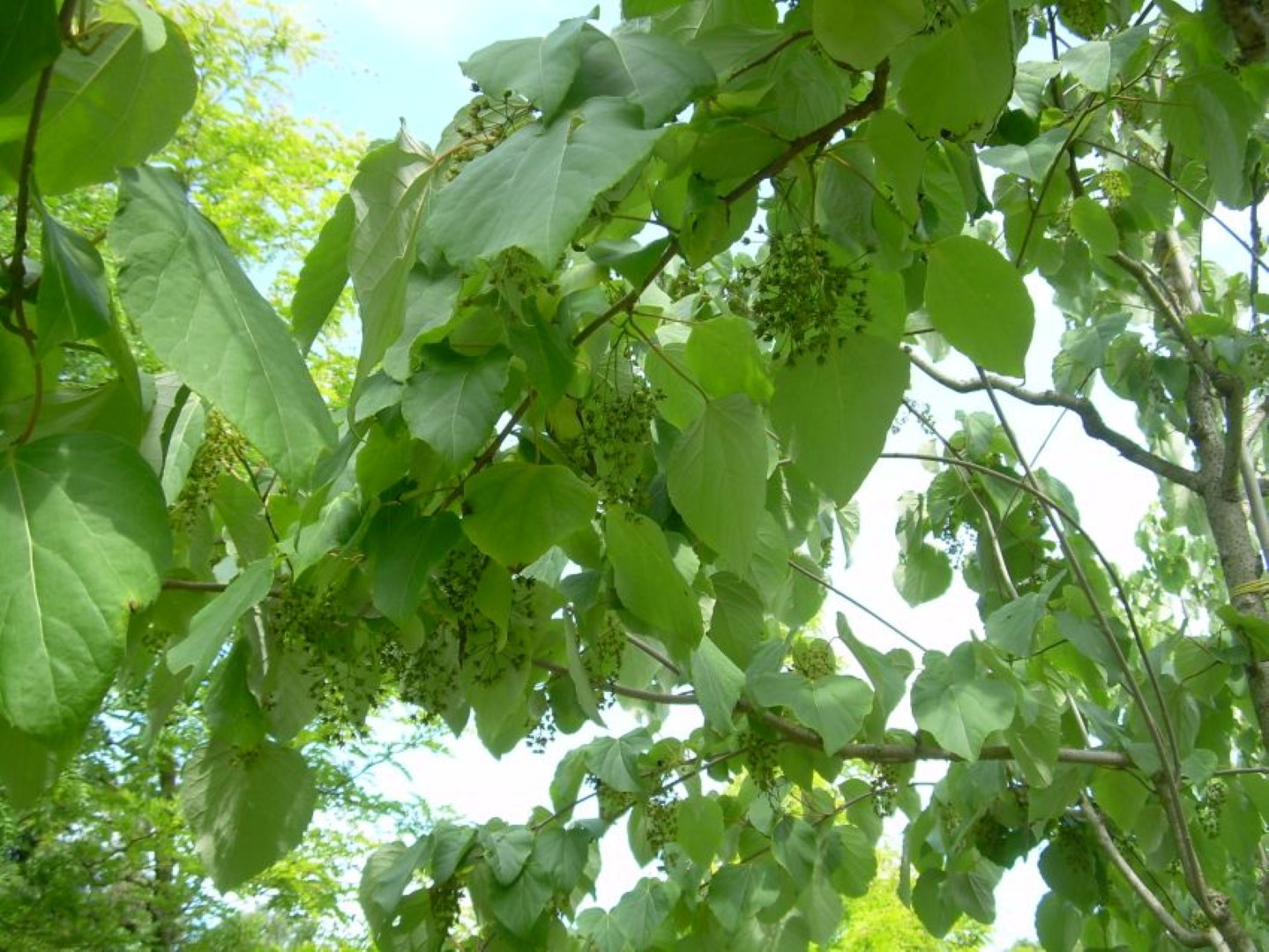 Idesia polycarpa bloeit in juni.