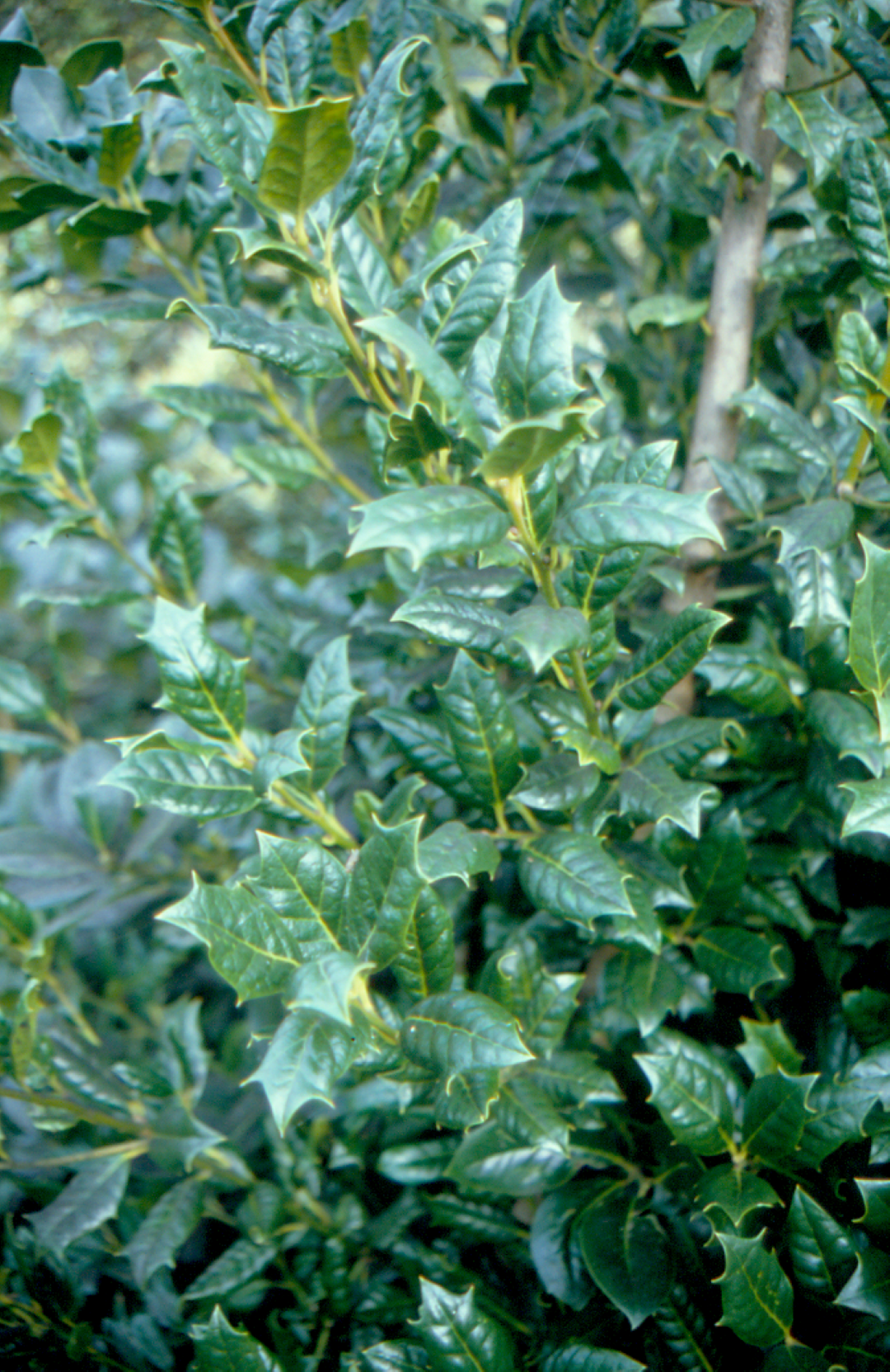 ovaal tot langwerpig, donker olijfgroen, met 2 - 3 tanden aan iedere kant, 5 - 8 cm lang en 4 - 5 cm breed, wintergroen