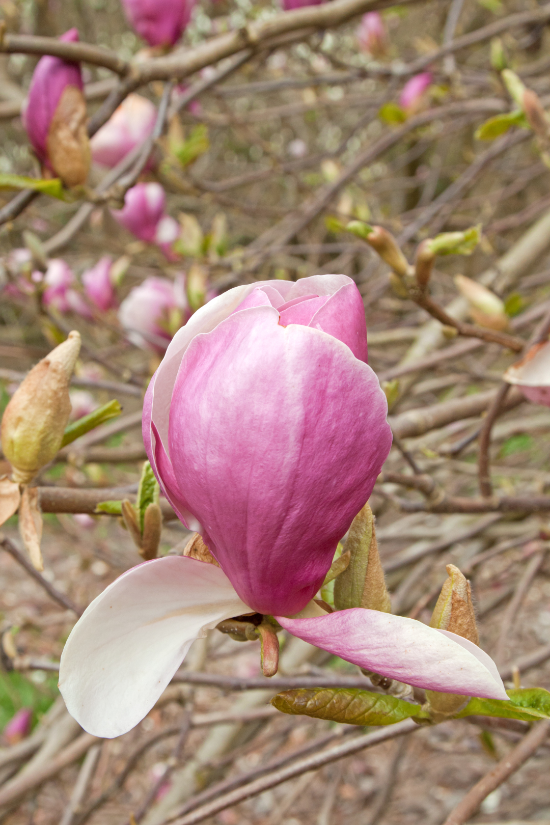 Magnolia ×soulangeana 'Lennei', vanuit een grote, dichtvertakte struikvorm uitgroeiend tot een kleine meerstammige boom met een breed vaasvormige tot breed eironde kroon die uiteindelijk circa 8 m hoog kan worden. De bloemen zijn breed tulpvormig. De relatief brede bloembladeren zijn egaal warm rozepaars aan de buitenkant en crèmewit aan de binnenzijde. De bloemen openen iets later dan bij andere cultivars van Magnolia soulangeana, omstreeks half/eind april. Werd halverwege de 19e eeuw in Lombardije, Noord-Italië gevonden en vernoemd naar de Duitse botanicus Peter Joseph Lenné. Geschikt als parkboom en in tuinen