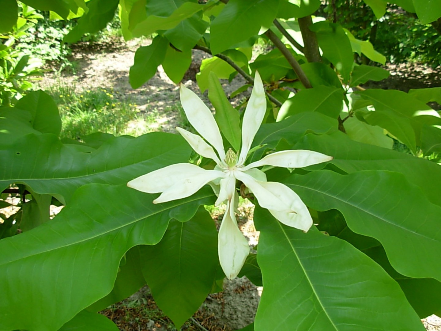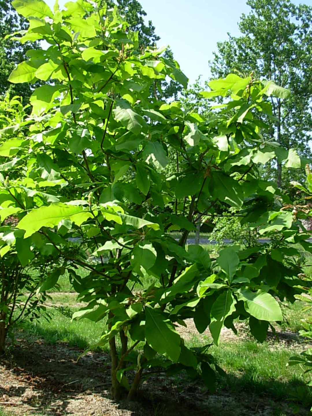 Forse, meerstammige boom met een losse, breed uitgroeiende kroon en een gladde grijze schors. De paarsbruine twijgen zijn voorzien van een dunne waslaag en hebben bruinpaarse knoppen. Het omgekeerd eironde blad is bijzonder groot, maximaal 40 tot 50 cm en de bovenzijde is glanzend en frisgroen. De onderzijde van jong blad is licht grijsgroen en licht behaard. In de zomer verschijnen roomwitte, komvormige bloemen die meer opstaand zijn dan bij M. hypoleuca. De crèmewitte kroonbladeren zijn 10 - 12 cm lang. De lange meeldraden zijn aan de basis paars. De bloemen verspreiden een lichte, ietwat onaangename geur en worden gevolgd door eivormige, purperrode vruchten met een grootte van circa 10 cm. In de vruchten bevinden zich karmijnrode zaden. Na jaren een prachtige solitair die veel ruimte vraagt.