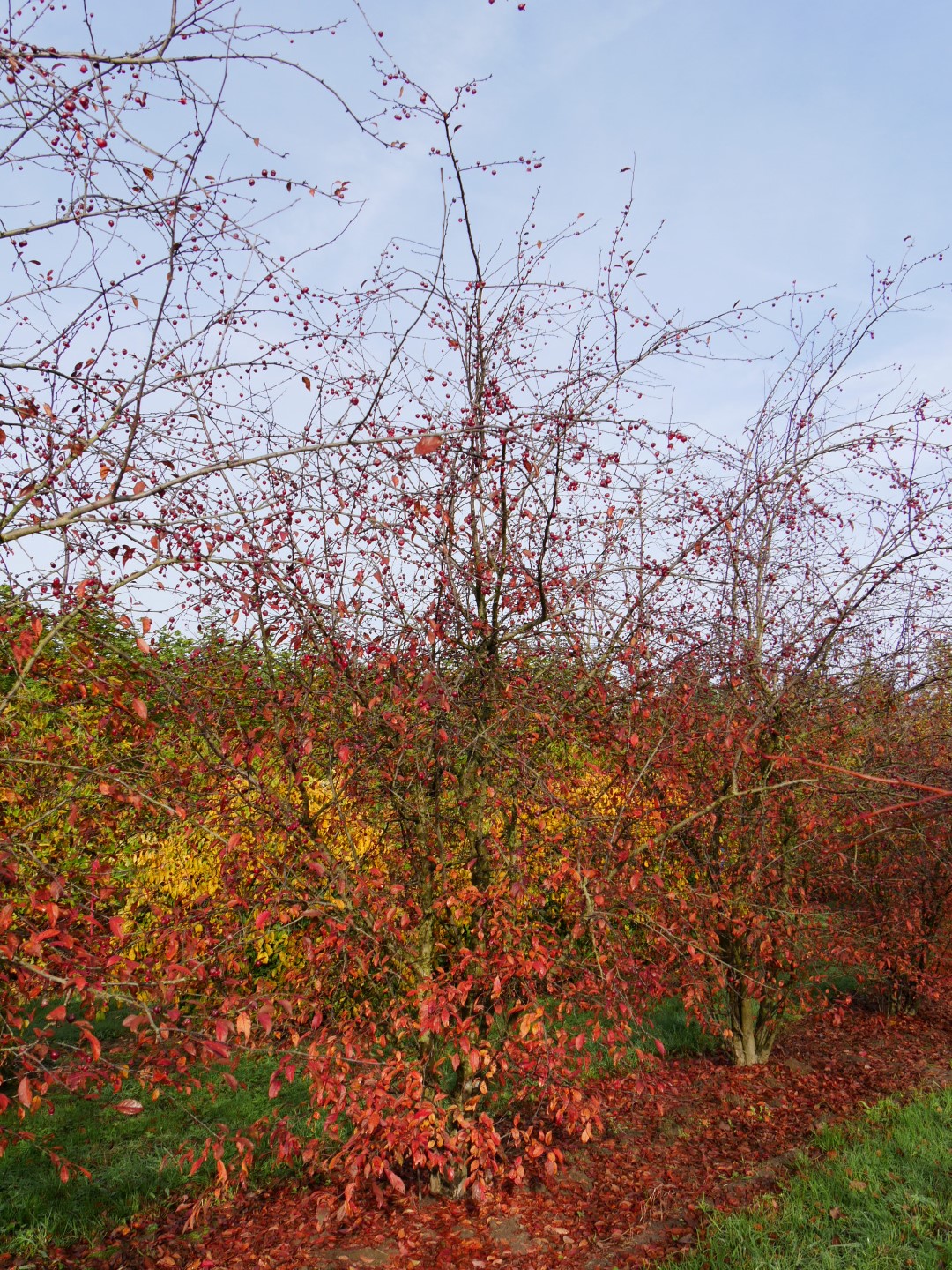 De bladeren van de Malus 'Profusion' kleuren in de herfst rood.