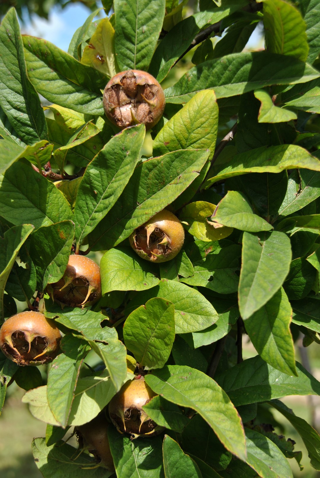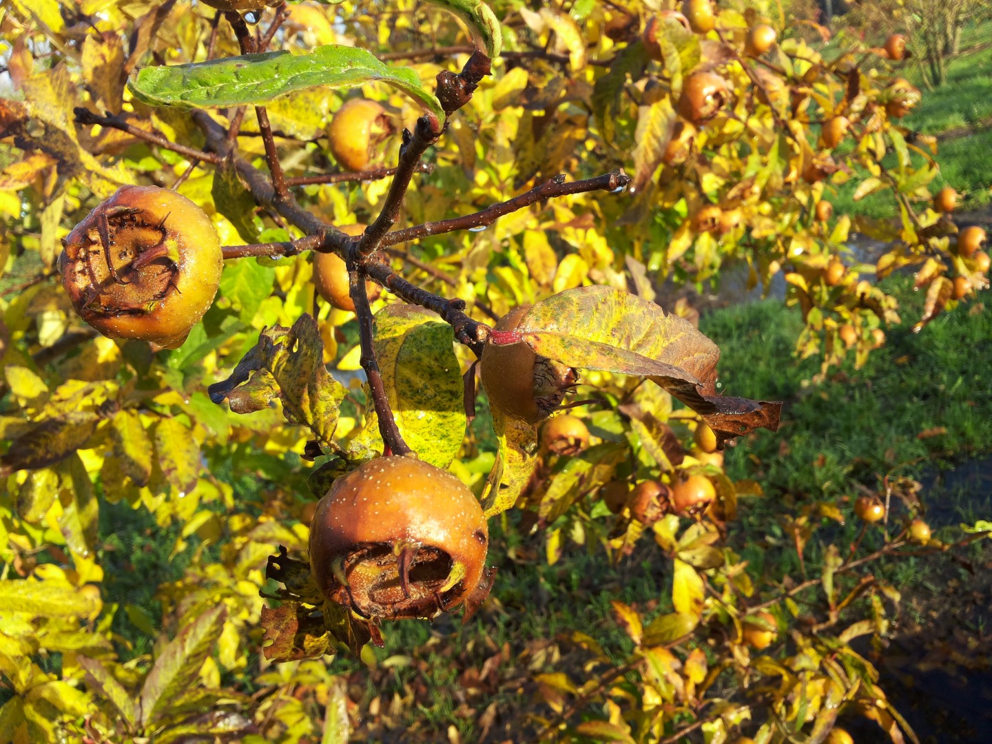 De bladeren van de Mespilus germanica 'Westerveld' kleuren in de herfst geel, rood.