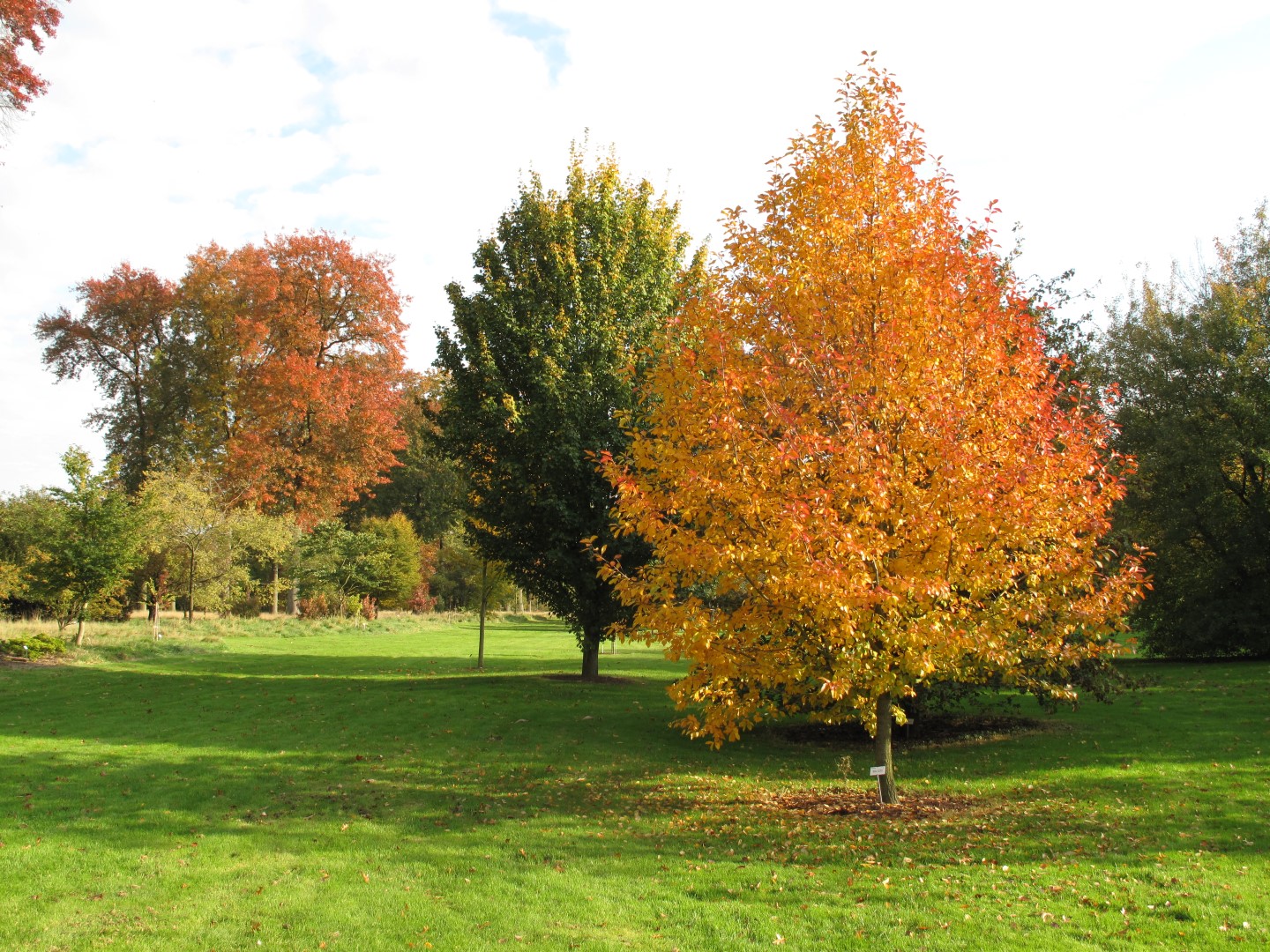 De bladeren van de Nyssa sylvatica 'Wisley Bonfire' kleuren in de herfst geel, oranje, rood.