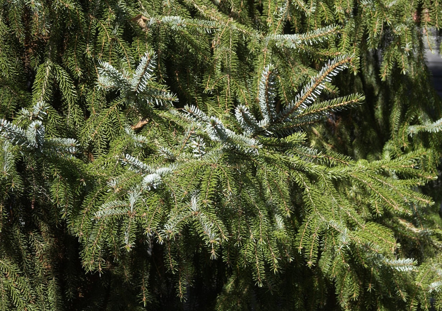 naalden, donkergroen, glimmend, 0,5 - 2 cm, onderzijde zilvergrijs, groenblijvend