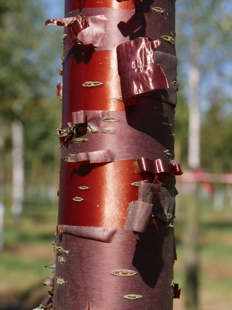 twijgen donkerbruin, bast glanzend mahonierood, sterk afbladderend