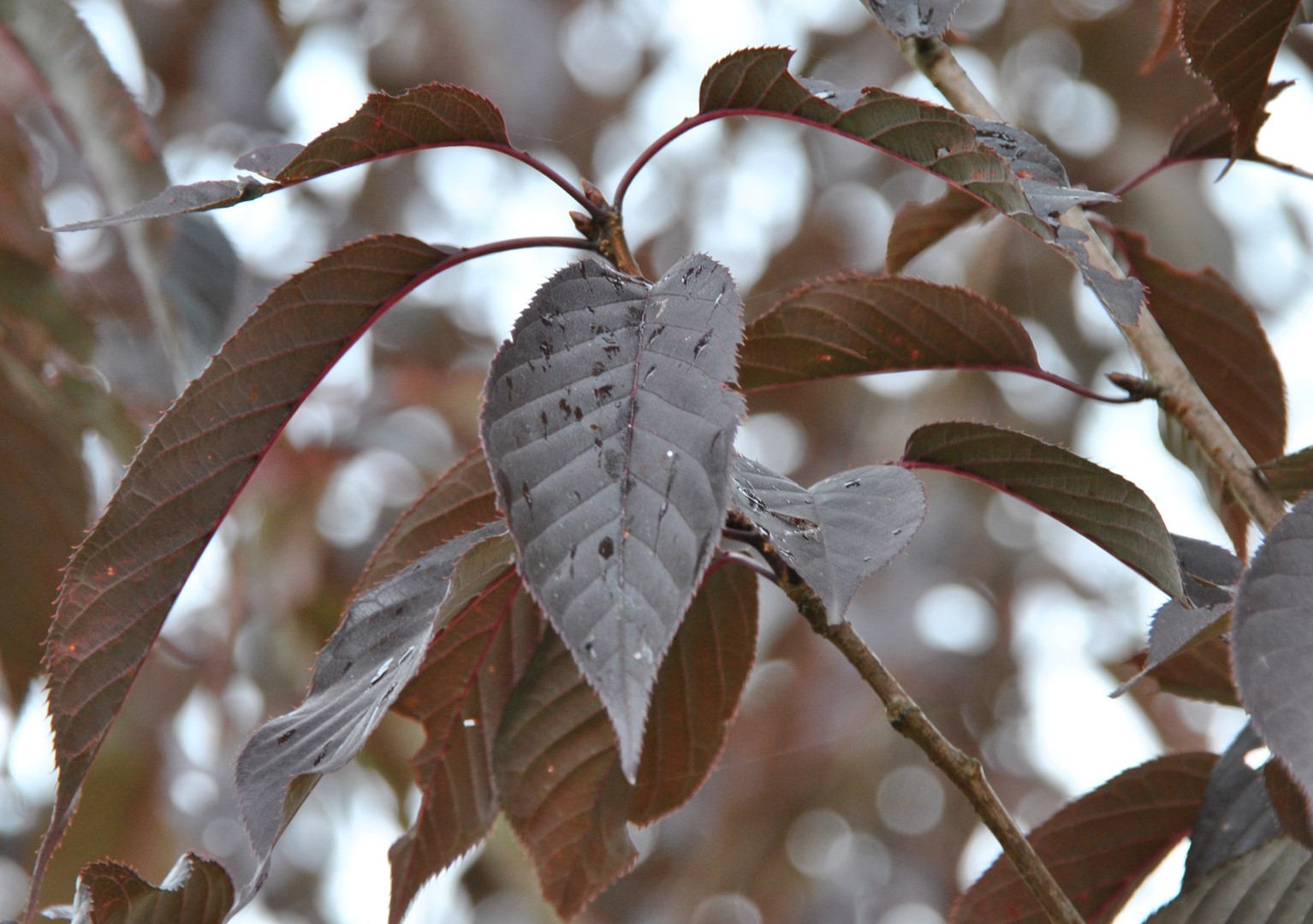 De bladeren van de Prunus serrulata 'Royal Burgundy' kleuren in de herfst oranje, rood.