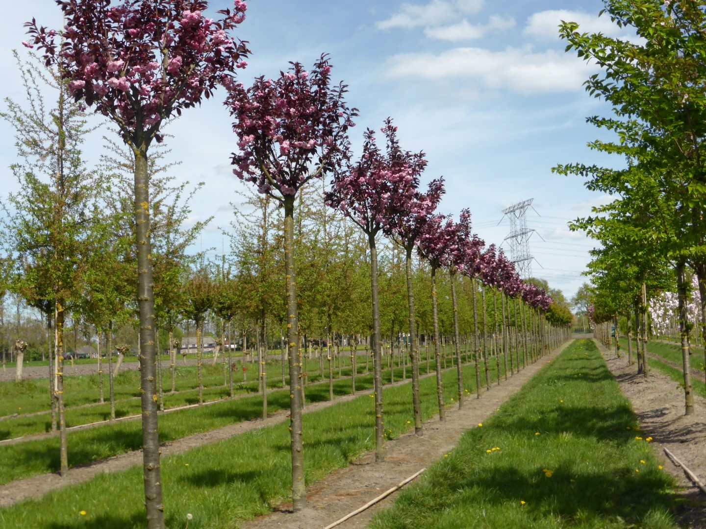 Prunus serrulata 'Royal Burgundy' bloeit in april.