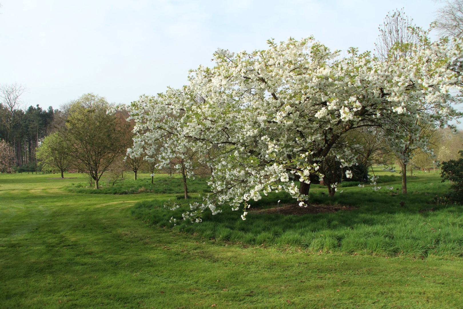 Prunus serrulata 'Shirotae' bloeit in april.