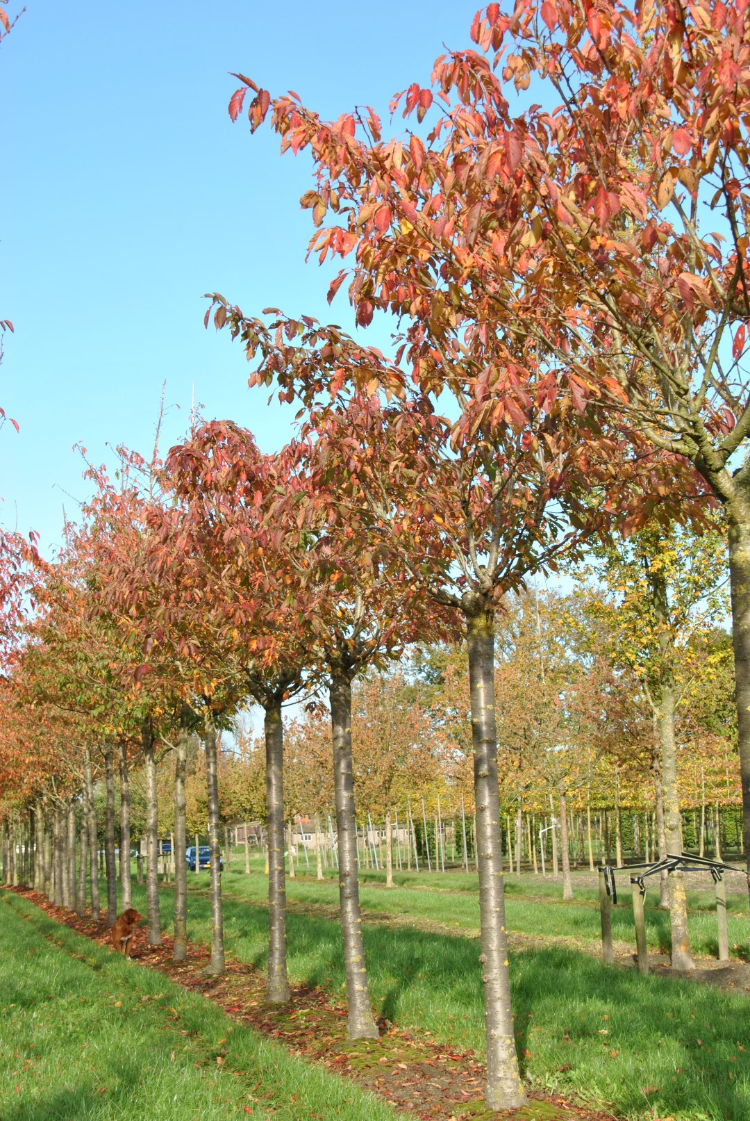 De bladeren van de Prunus serrulata 'Ukon' kleuren in de herfst rood, purper.