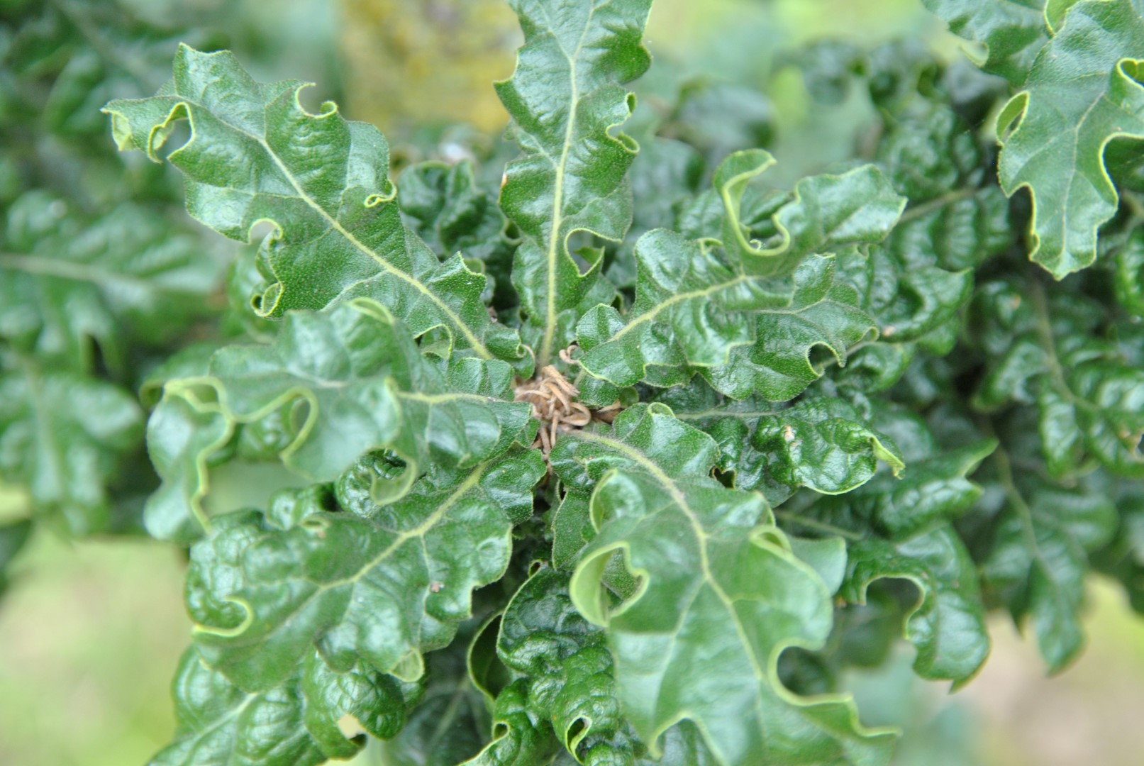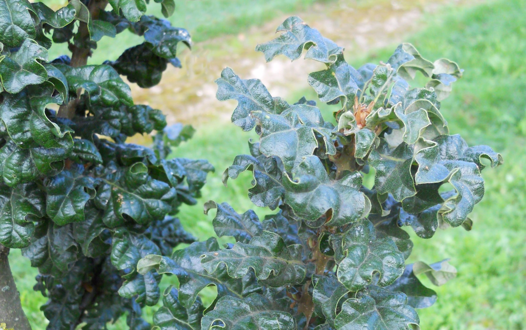 langwerpig tot ovaal, lobben ondiep, donkergroen, bladeren en lobben sterk gekruld, 5 - 6 cm