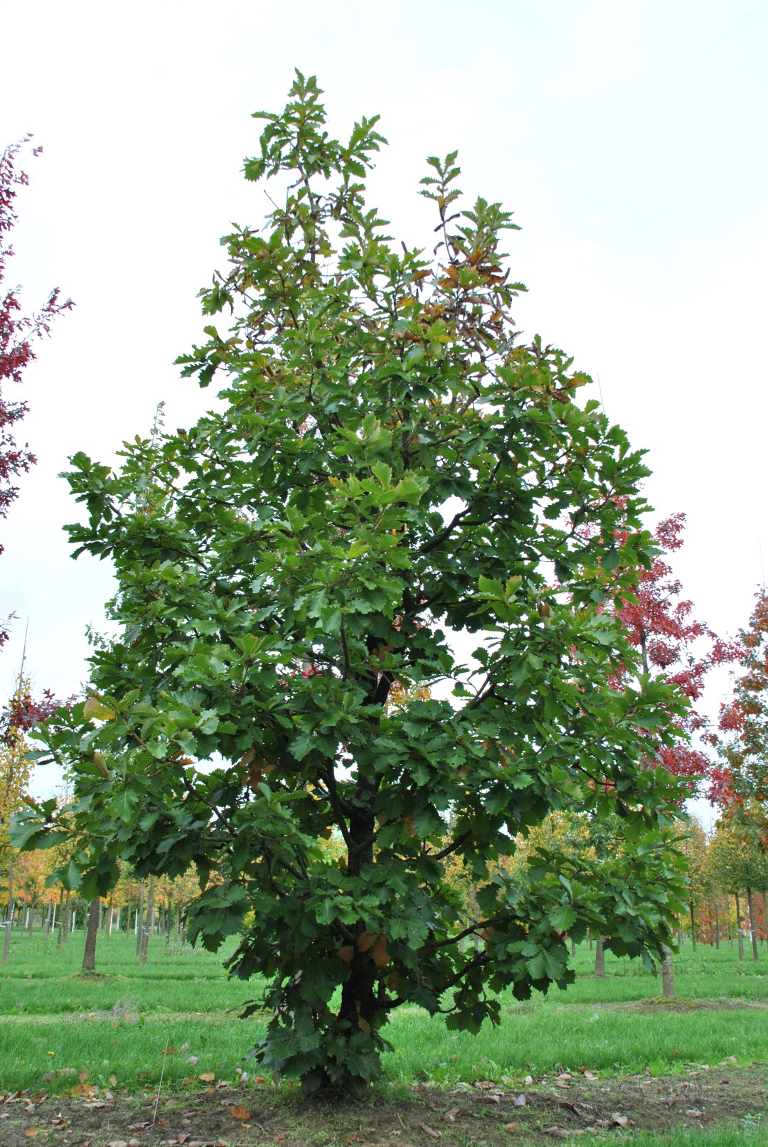 Zeldzame en langzaam groeiende boom met een hoogte van 6 - 8 m. De stam is ruw en donkergrijs en de opvallend dikke twijgen zijn grijs behaard, later kaal. Het blad is langwerpig en zeer diep ingesneden en de smalle lobben zijn getand. Aan de bovenzijde is het blad mat donkergroen, de onderzijde is lichtergroen en fluwelig behaard. Jong blad is aan beide zijde behaard. Eikels staan in kleine bundels, zijn tot 2 cm groot en voor de helft omsloten door het napje. Deze napjes zijn bezet met lange smalle schubben die afstaan of teruggebogen zijn. De boom is al op jonge leeftijd vruchten dragend. Het diep ingesneden blad met de smalle lobben geeft deze kleine boom een opvallende en fraaie textuur.