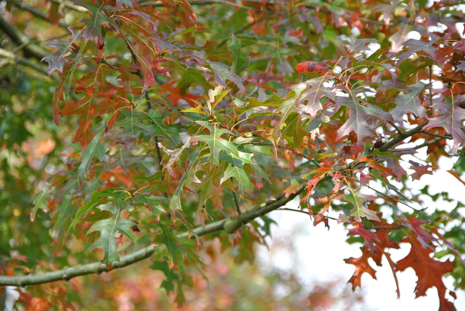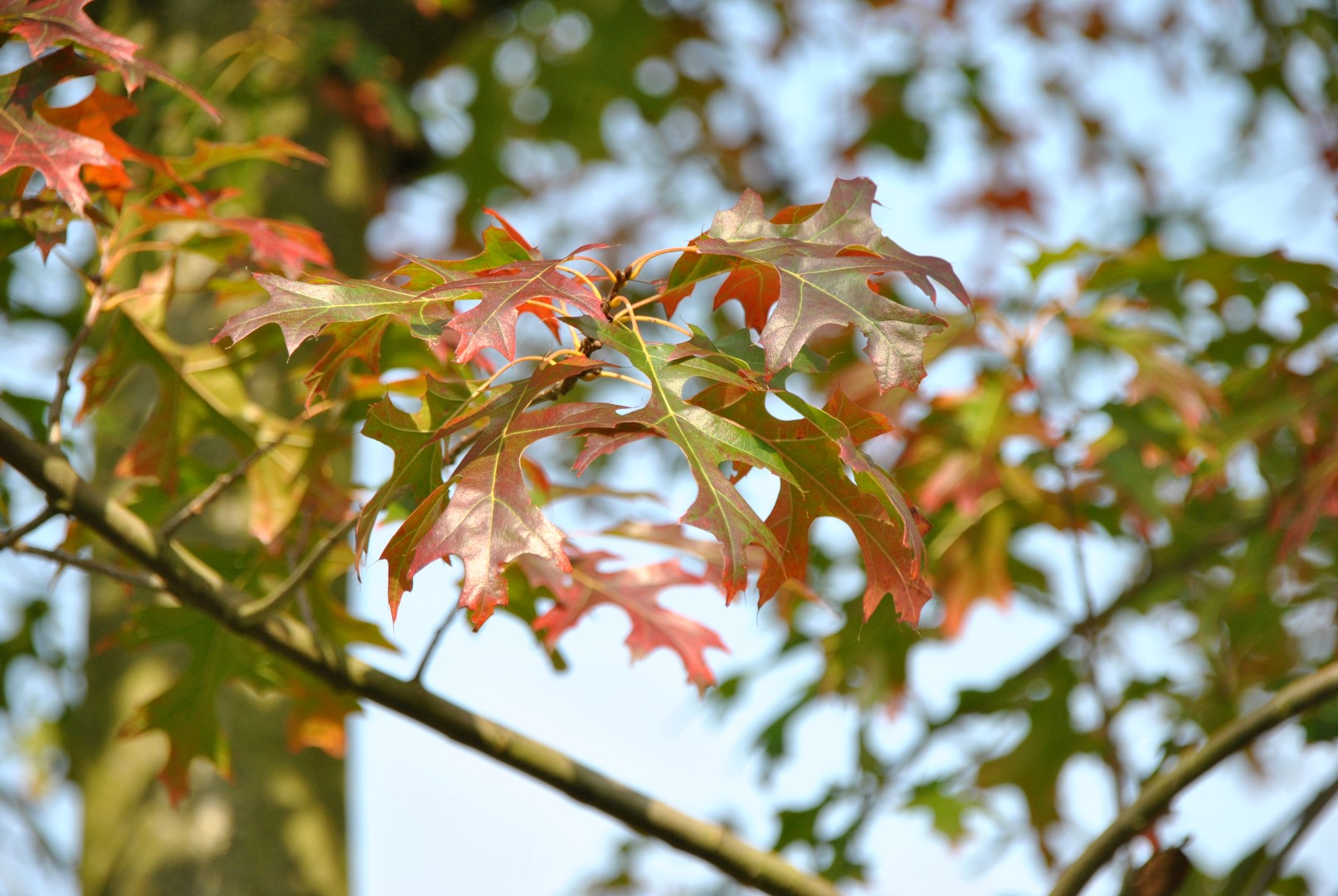De bladeren van de Quercus ellipsoidalis kleuren in de herfst rood, purper.