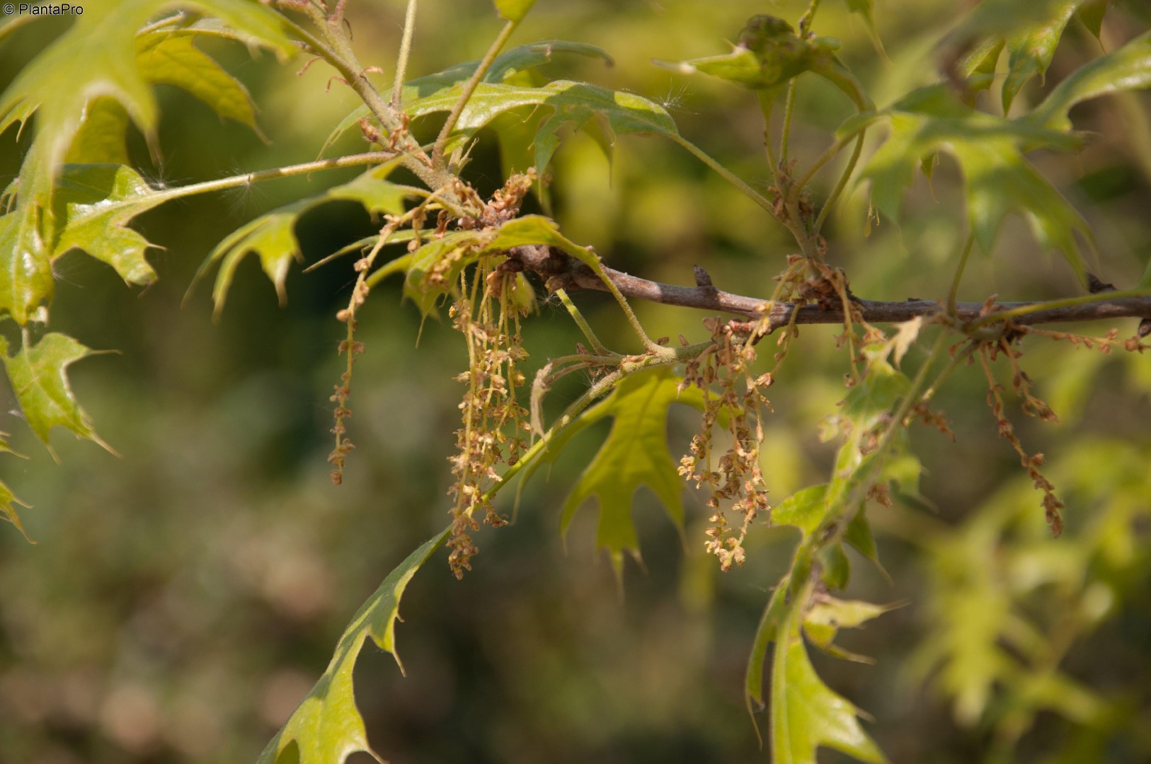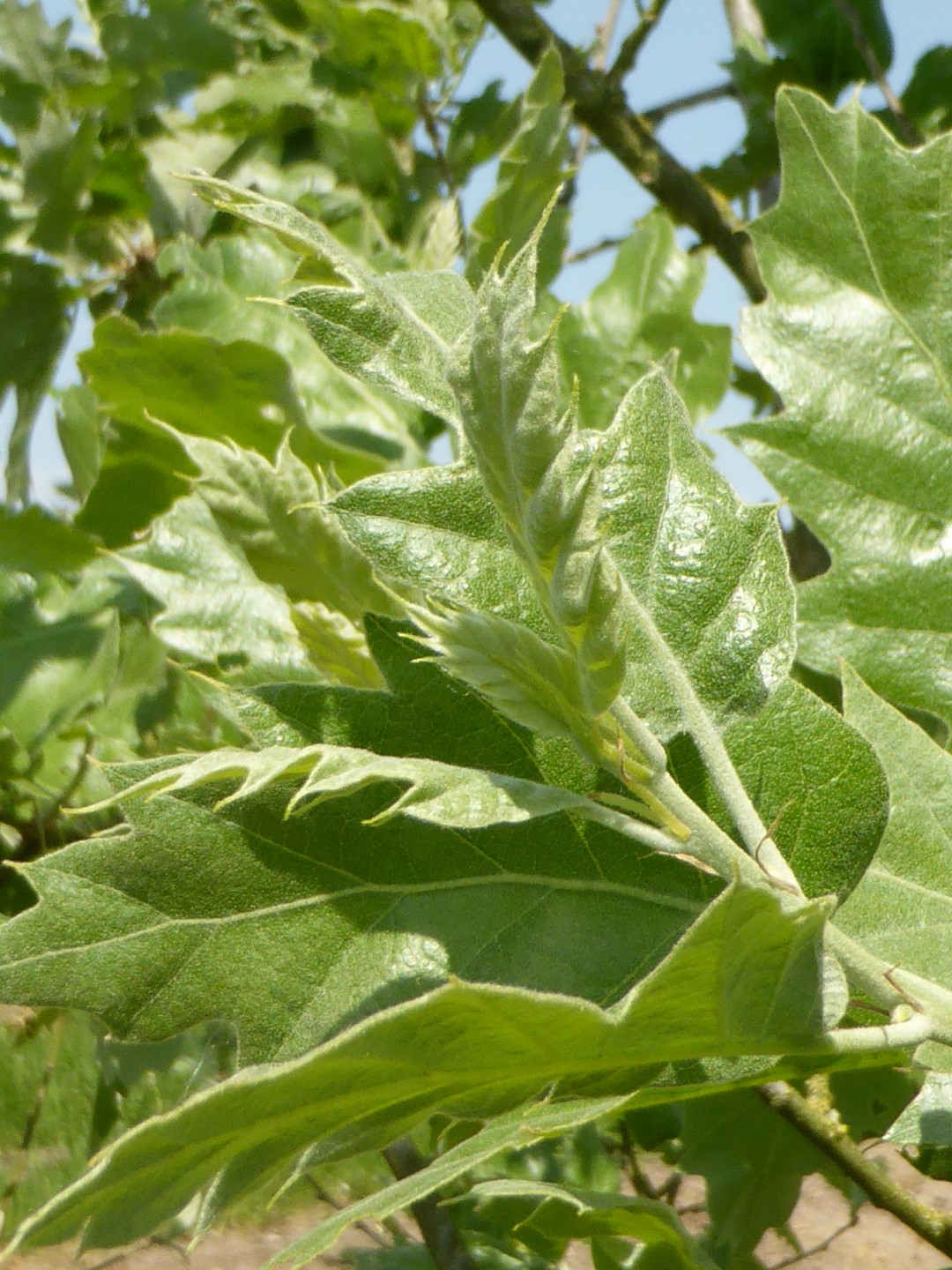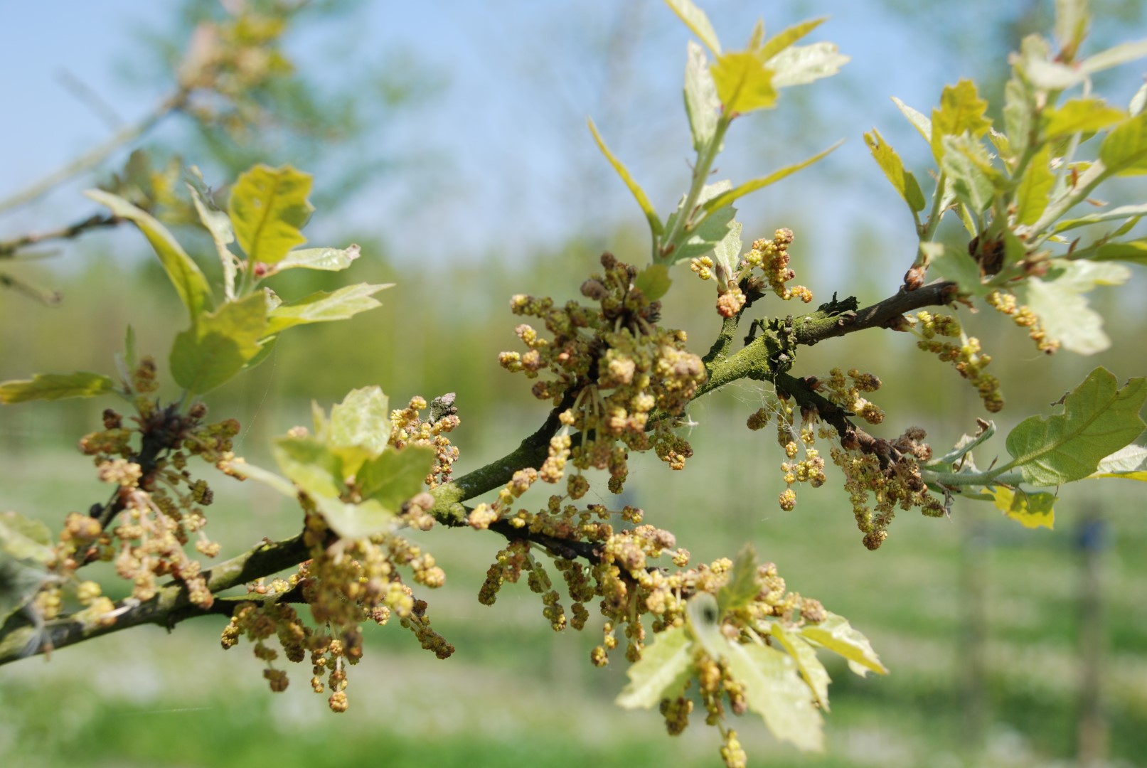 Quercus ithaburensis 'Hemelrijk Silver' bloeit in mei.