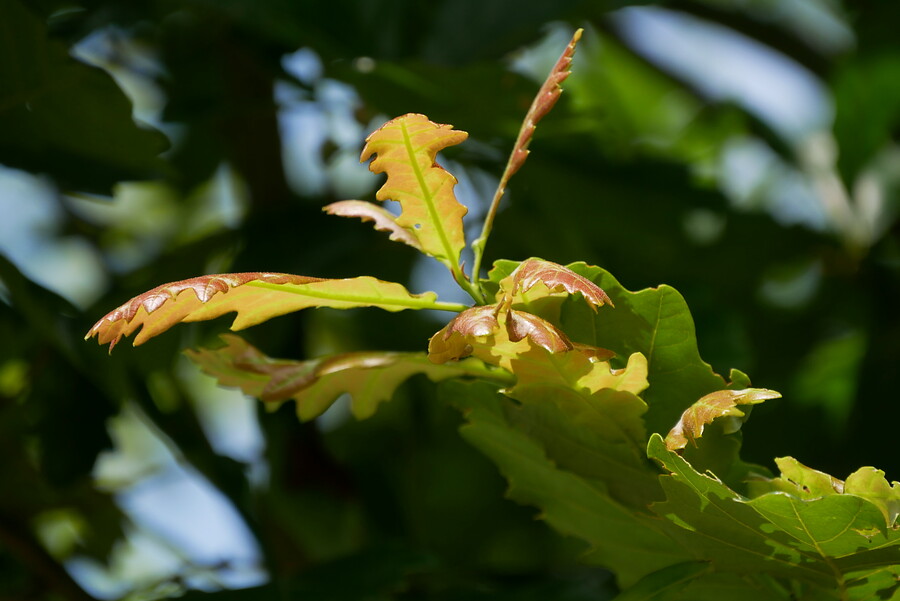 Quercus ×macdanielii HERITAGE ('Clemons') bloeit in mei.