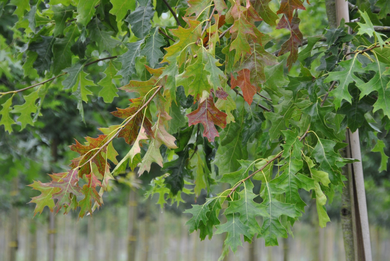 De bladeren van de Quercus palustris 'Pendula' kleuren in de herfst rood.