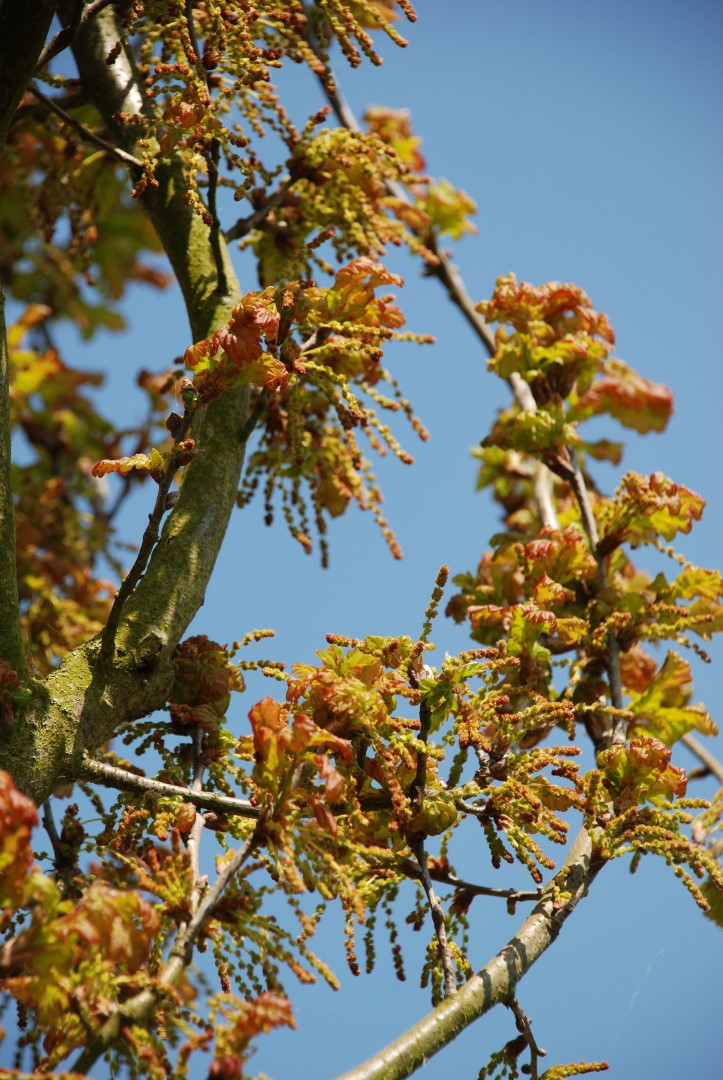 Quercus robur 'Fastigiata Purpurea' bloeit in mei.