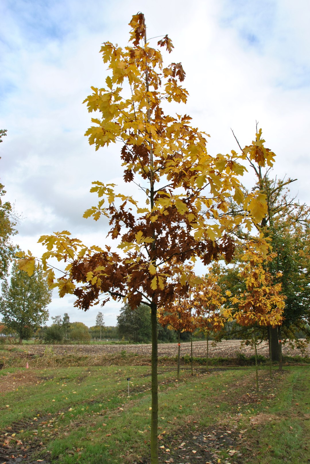 De bladeren van de Quercus rubra 'Magic Fire' kleuren in de herfst geel, oranje.
