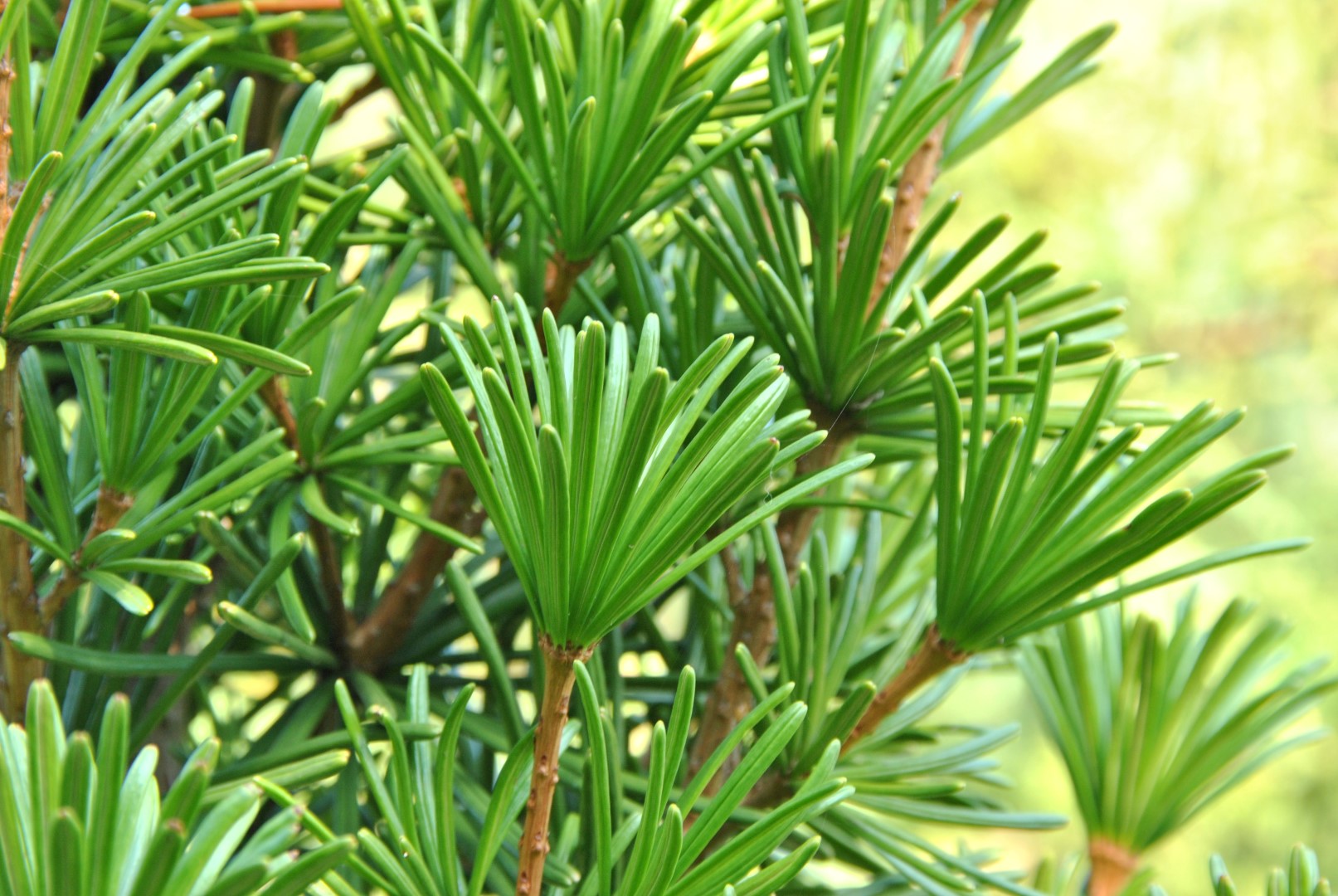 korte schubachtige naalden van circa 0,5 cm en zachte, brede naalden van 10 - 13 cm, glanzend donkergroen, groenblijvend