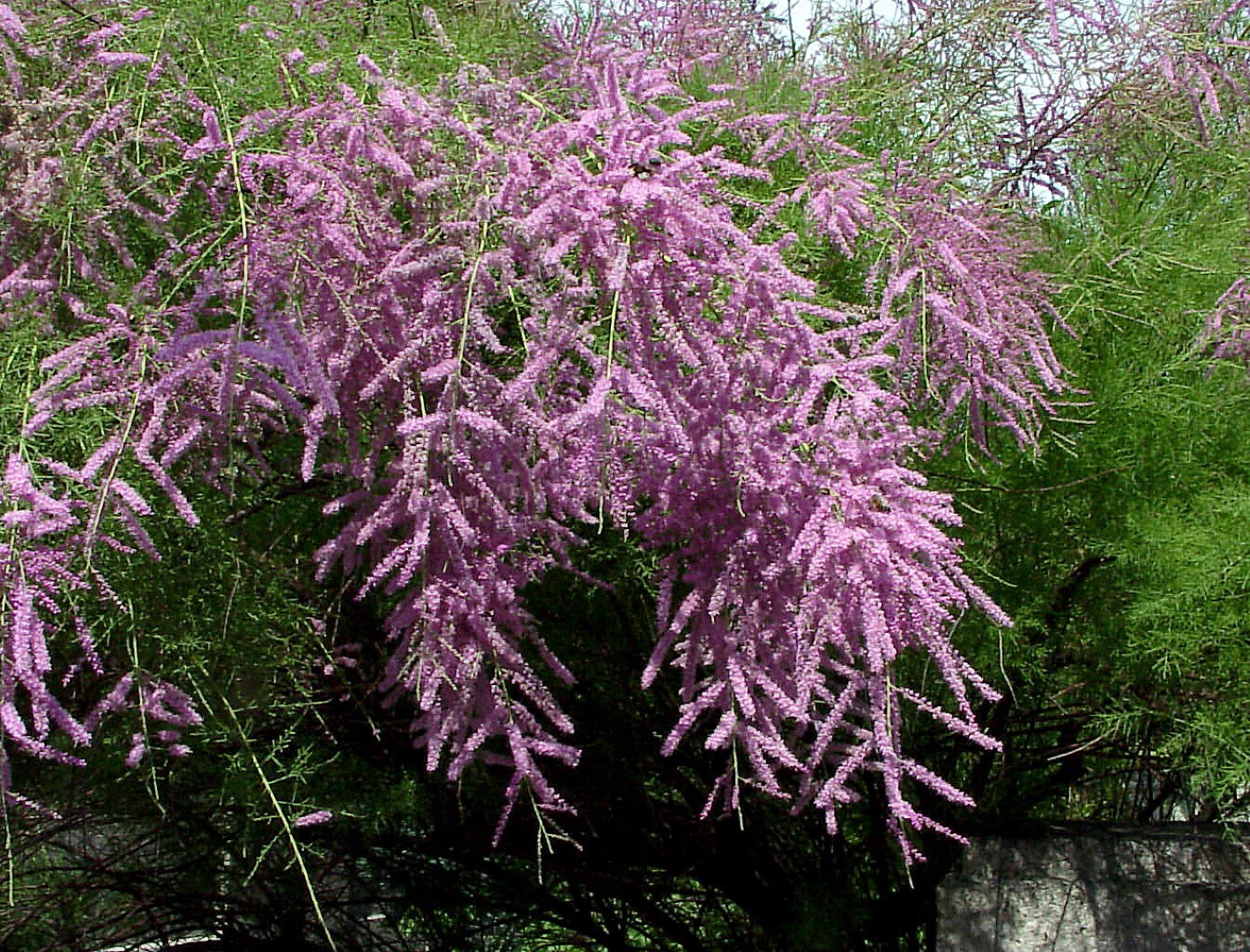 Tamarix ramosissima 'Pink Cascade' bloeit in juli.
