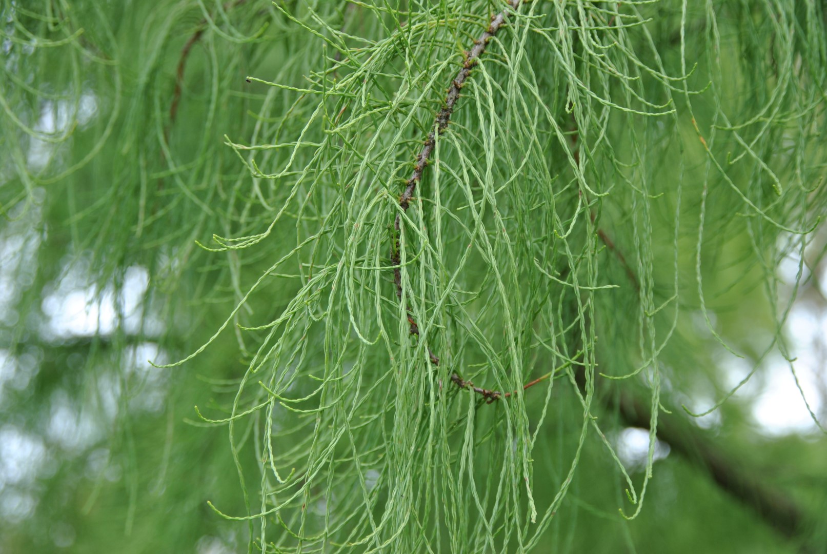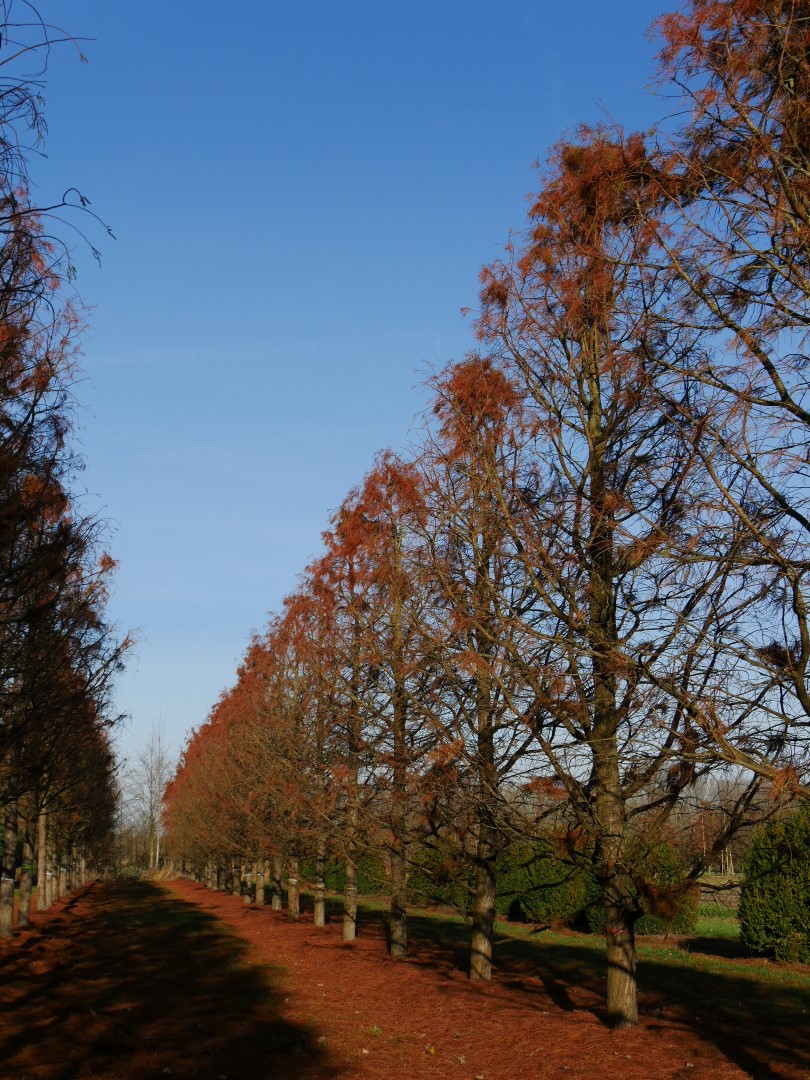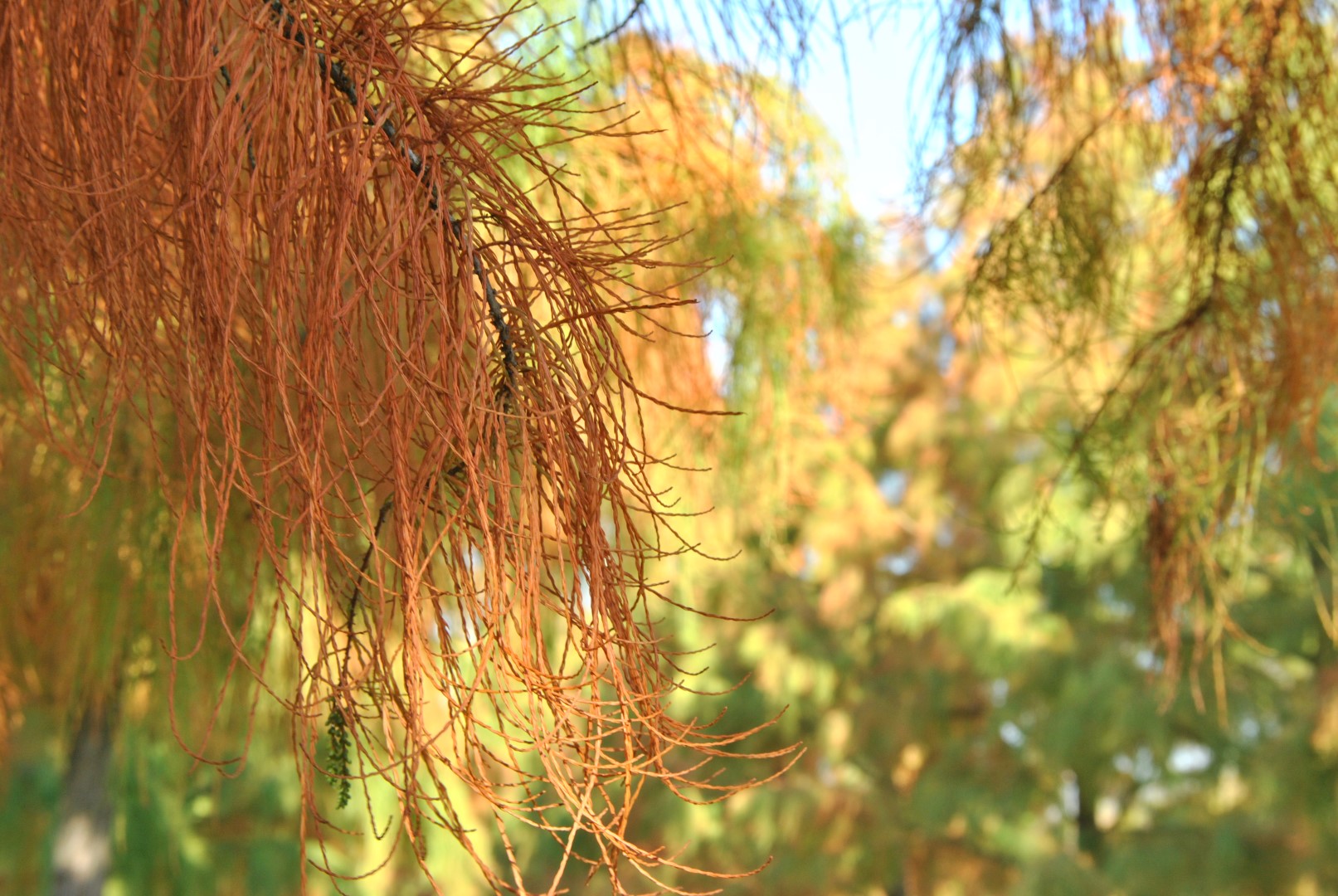 De bladeren van de Taxodium distichum 'Nutans' kleuren in de herfst oranje, rood.