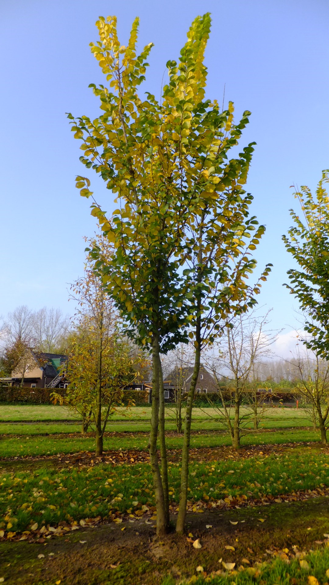 De bladeren van de Ulmus 'Clusius' kleuren in de herfst geel.