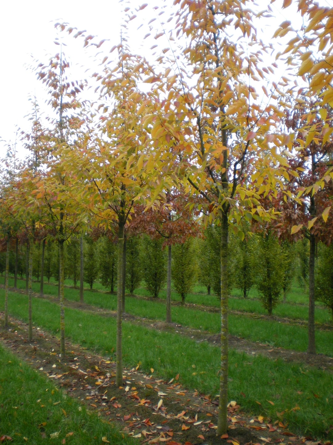 De bladeren van de Zelkova serrata GREEN VASE ('Flekova') kleuren in de herfst geel, oranje, rood.