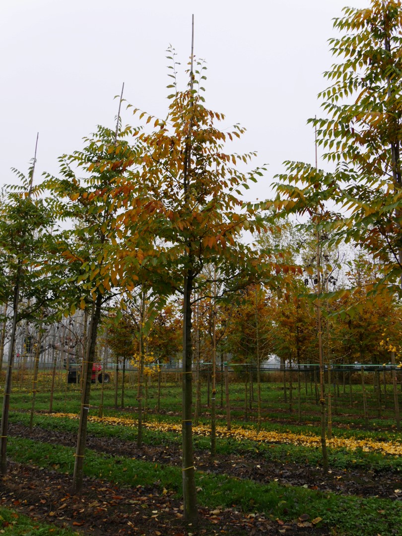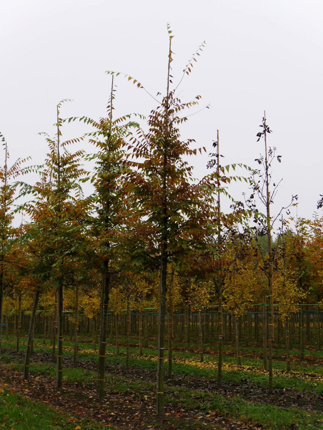 De bladeren van de Zelkova serrata 'Urban Ruby' kleuren in de herfst geel, oranje, rood.