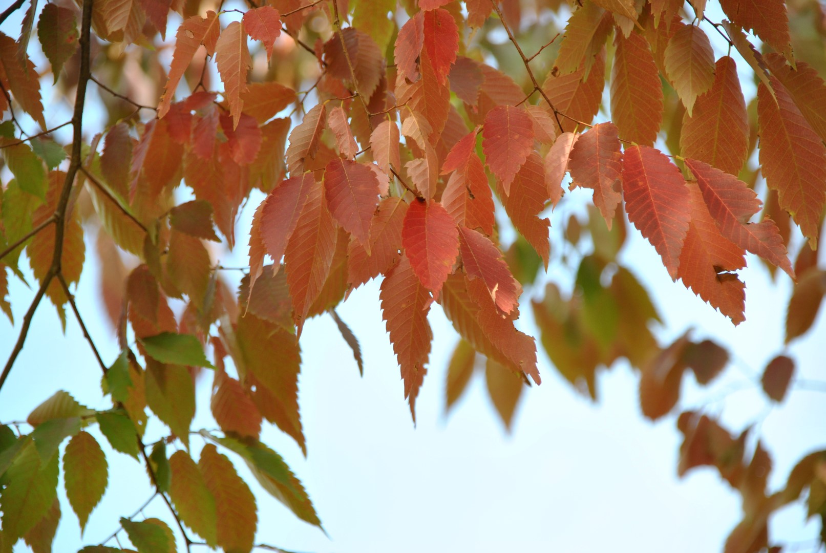 De bladeren van de Zelkova serrata kleuren in de herfst geel, oranje, rood.