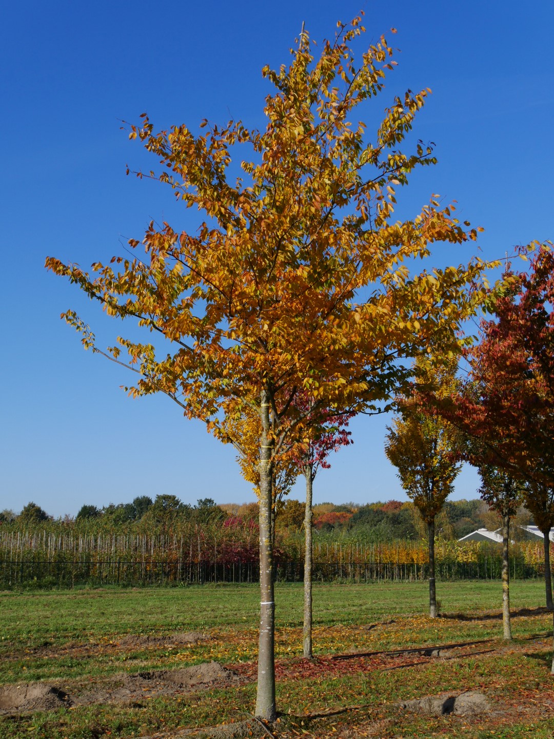 De bladeren van de Zelkova sinica kleuren in de herfst geel.